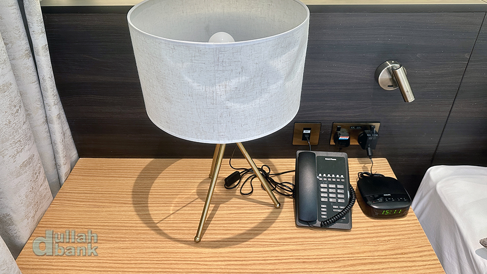 침대 양 옆에는 협탁 대신 벽에 고정된 선반 위에 여러 물품들이 놓여 있습니다.