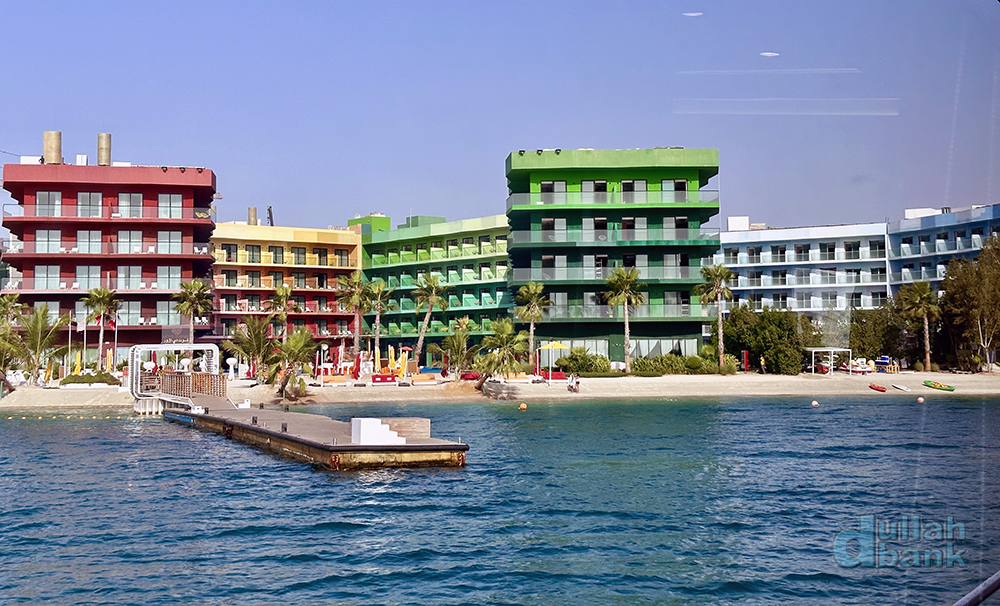리조트가 있는 유럽 메인랜드 섬이 나타납니다. 선착장에서 리조트까지는 편도 30~35분 정도 소요됩니다. 리조트 내 네 호텔은 건물 색깔로 구분됩니다.