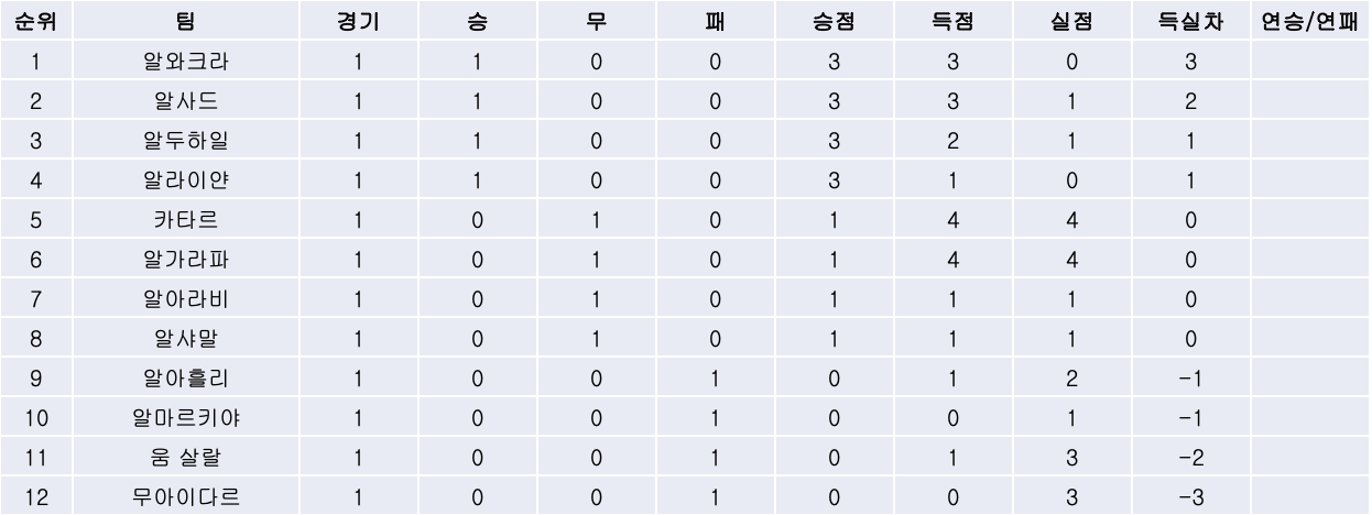 3) 알아라비와 알샤말의 경기에서는 자책골을 넣고 극장골까지 넣는 알샤말의 쇼타임 끝에 1대1 무승부로 승부를 가리지 못했습니다.