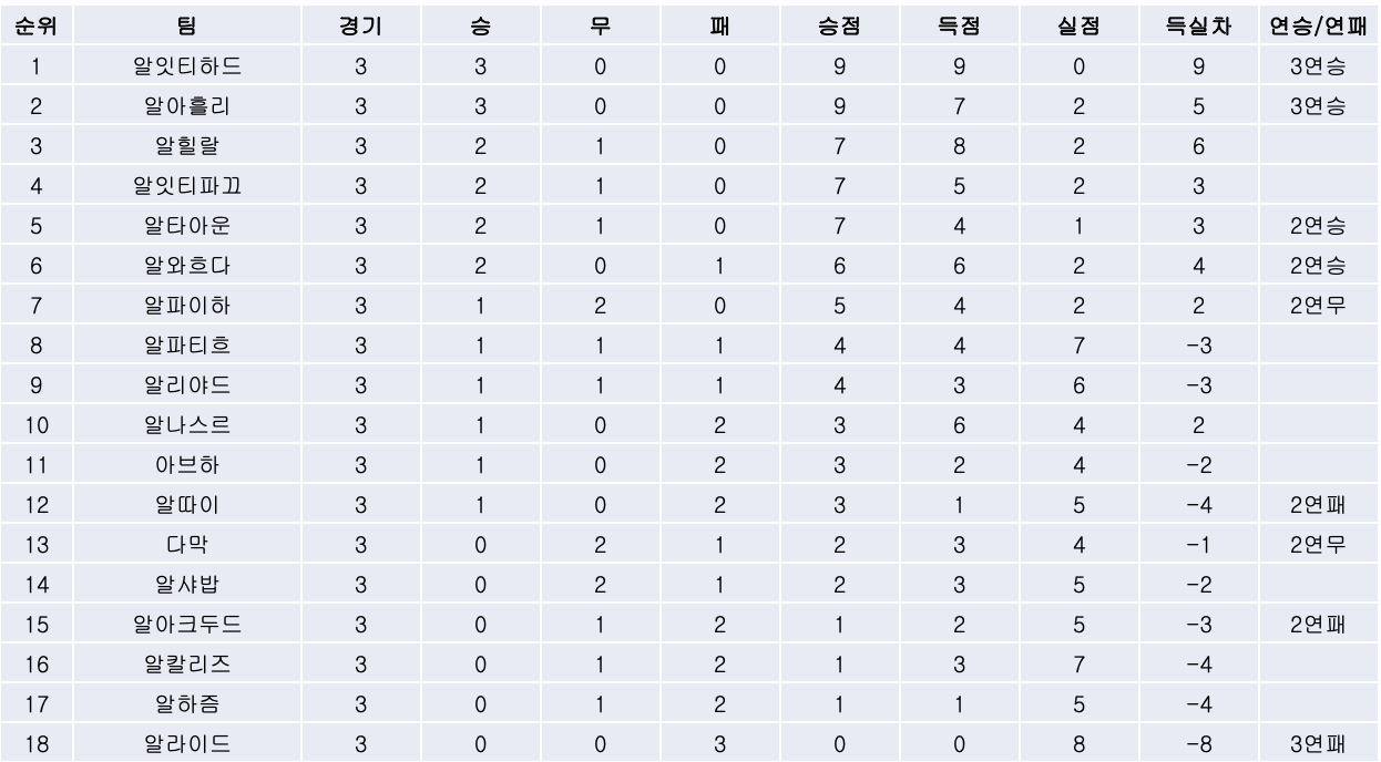 2) 알아흘리와 알아크두드의 경기에서는 무승부로 끝날 것 같던 후반 인저리 타임 막판에 터진 프랑크 케시에의 극장골로 알아흘리가 알아크두드를 3대0으로 꺾고 3연승을 달였습니다. 알아크두드는 개막전 무승부 이후 2연패