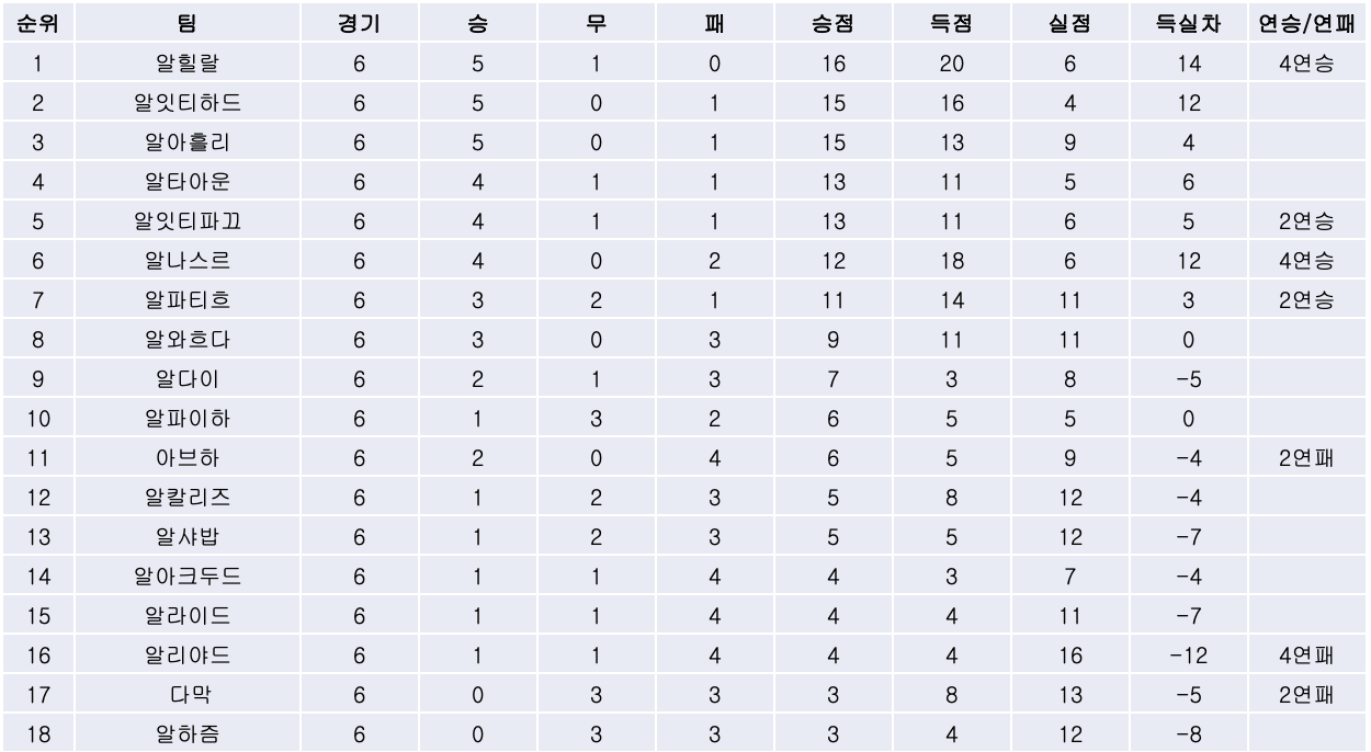 2) 2연패 중이었던 알와흐다는 다막과의 경기에서 상대 선수의 퇴장으로 인한 수적 우세를 펫세운 오디온 이갈로의 이적 후 첫 해트트릭에 힘입어 4대2 승리를 거두고 연패 탈출에 성공했습니다. 반면, 다막은 3연속 무승부 후 시즌 첫 2연패.
