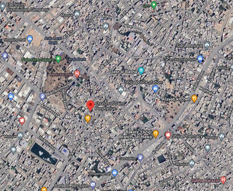 교최 위쪽 메디컬 센터로 표기된 곳이 바로 며칠전 폭격을 받은 알아흘리 아랍 병원