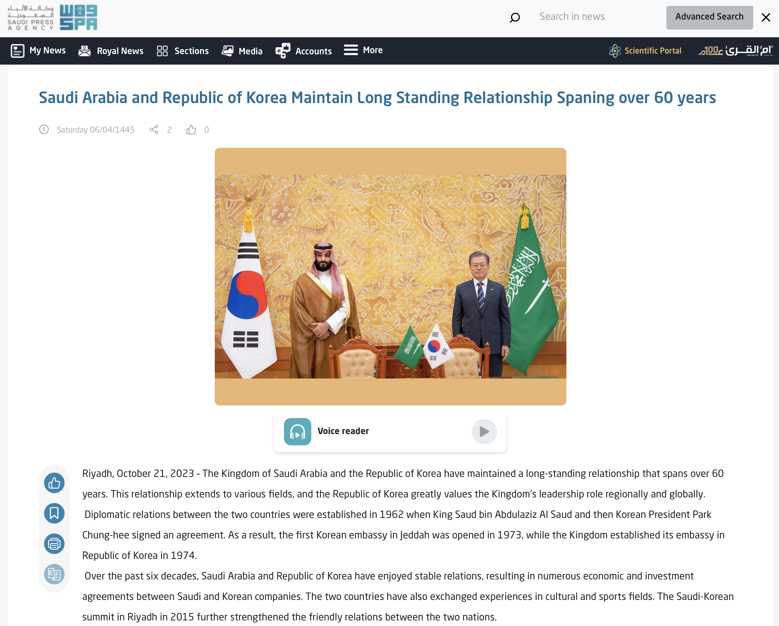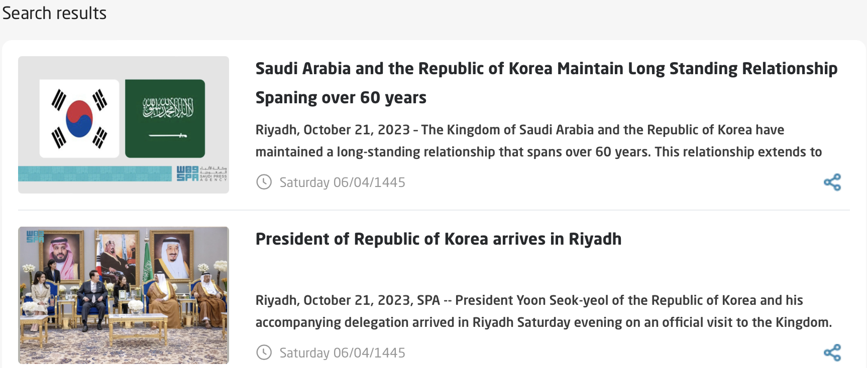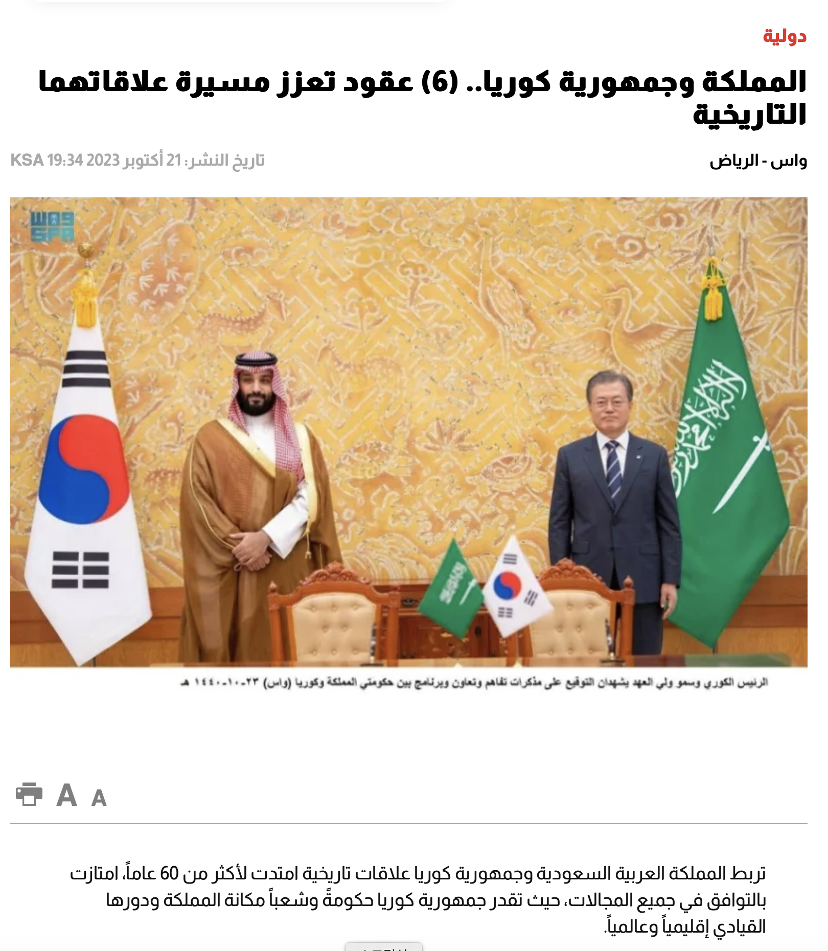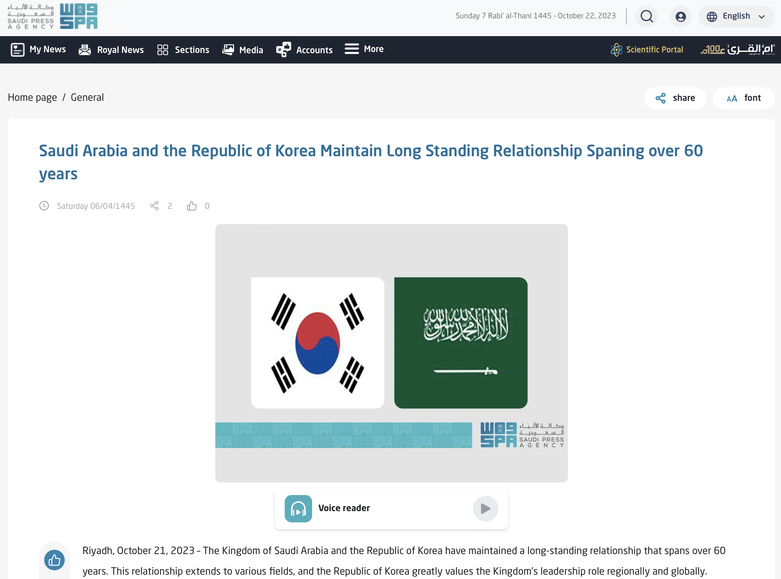 사우디 언론에선 윤석열 대통령의 도착 소식을 어떻게 다룰까 싶어 관영통신 SPA 홈페이지를 검색해 보다 윤 대통령의 국빈방문을 기념해 사우디와 한국의 역사적인 관계를 소개하는 기사가 먼저 메인 페이지에 올라왔기에 보려다 깜짝 놀랄 수 밖에 없었습니다.