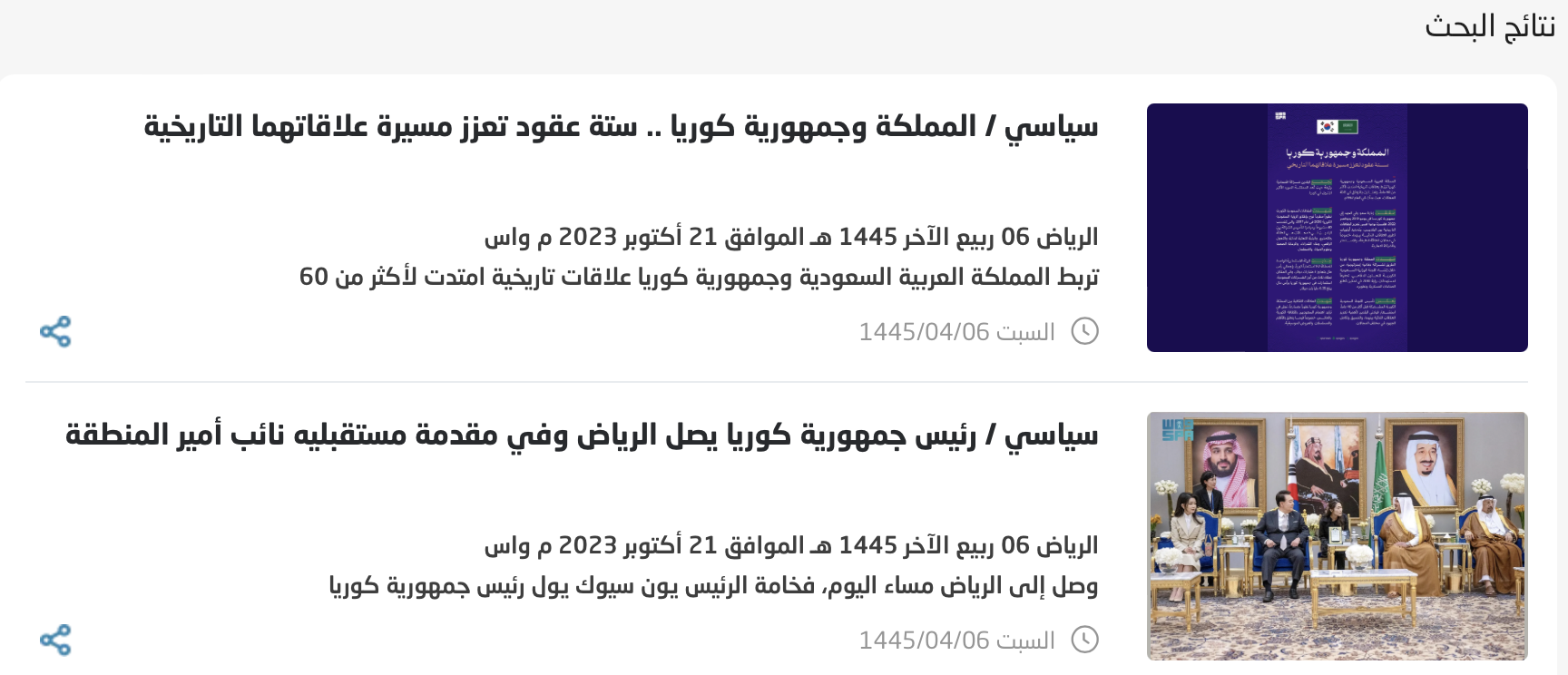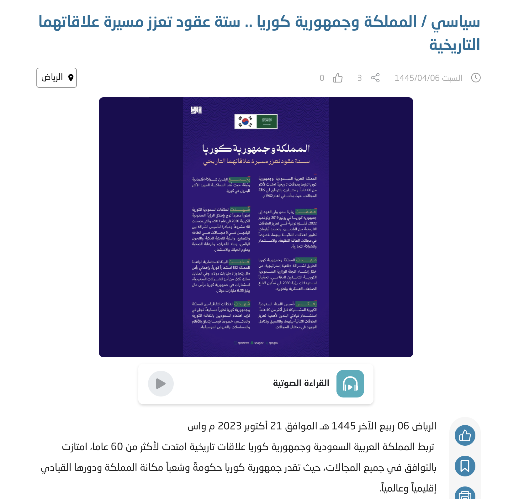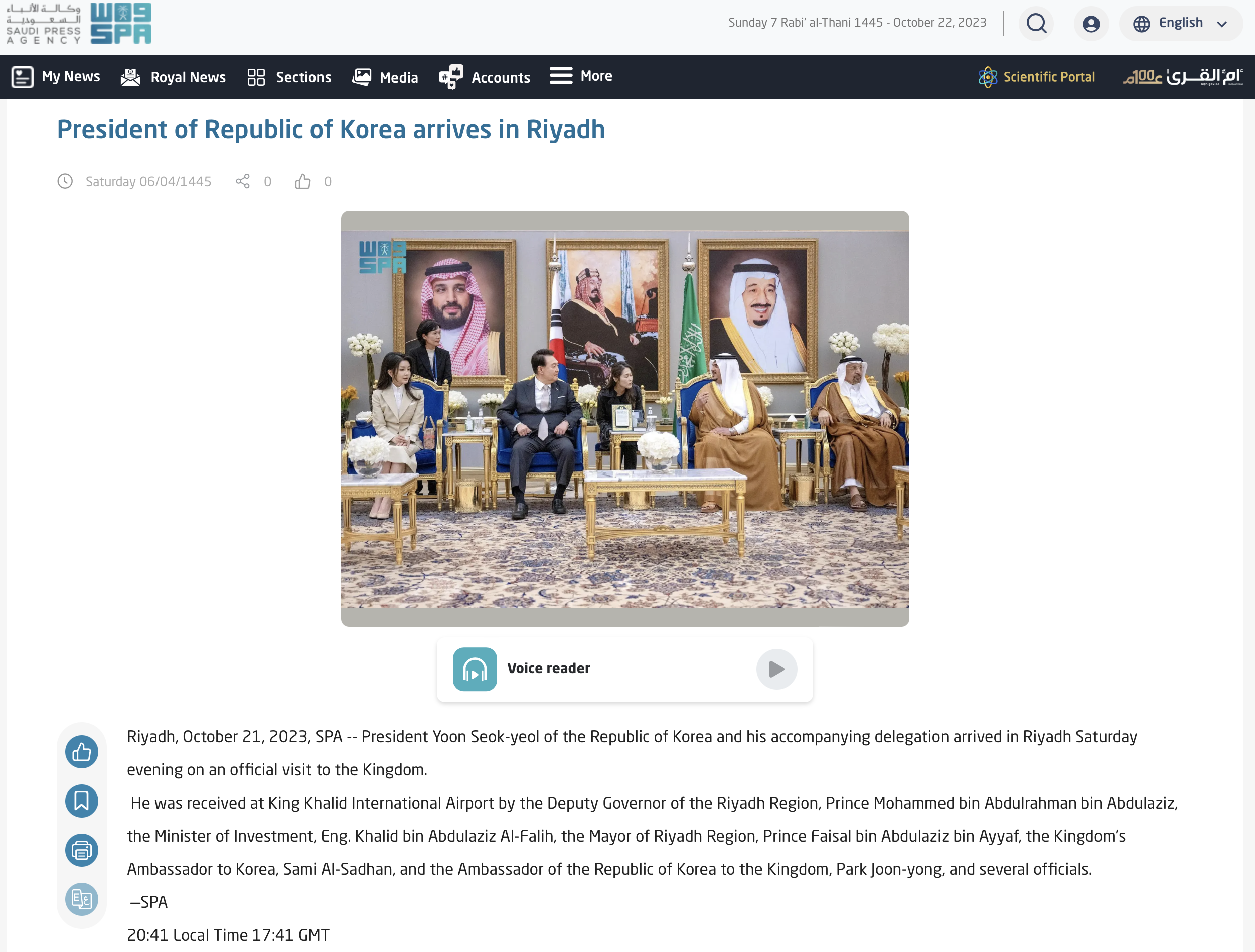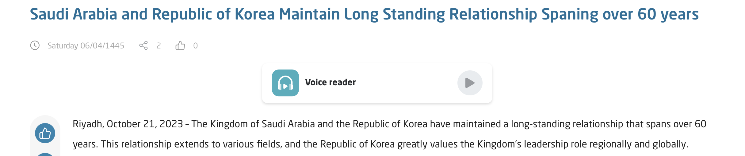 사우디 언론에선 윤석열 대통령의 도착 소식을 어떻게 다룰까 싶어 관영통신 SPA 홈페이지를 검색해 보다 윤 대통령의 국빈방문을 기념해 사우디와 한국의 역사적인 관계를 소개하는 기사가 먼저 메인 페이지에 올라왔기에 보려다 깜짝 놀랄 수 밖에 없었습니다.