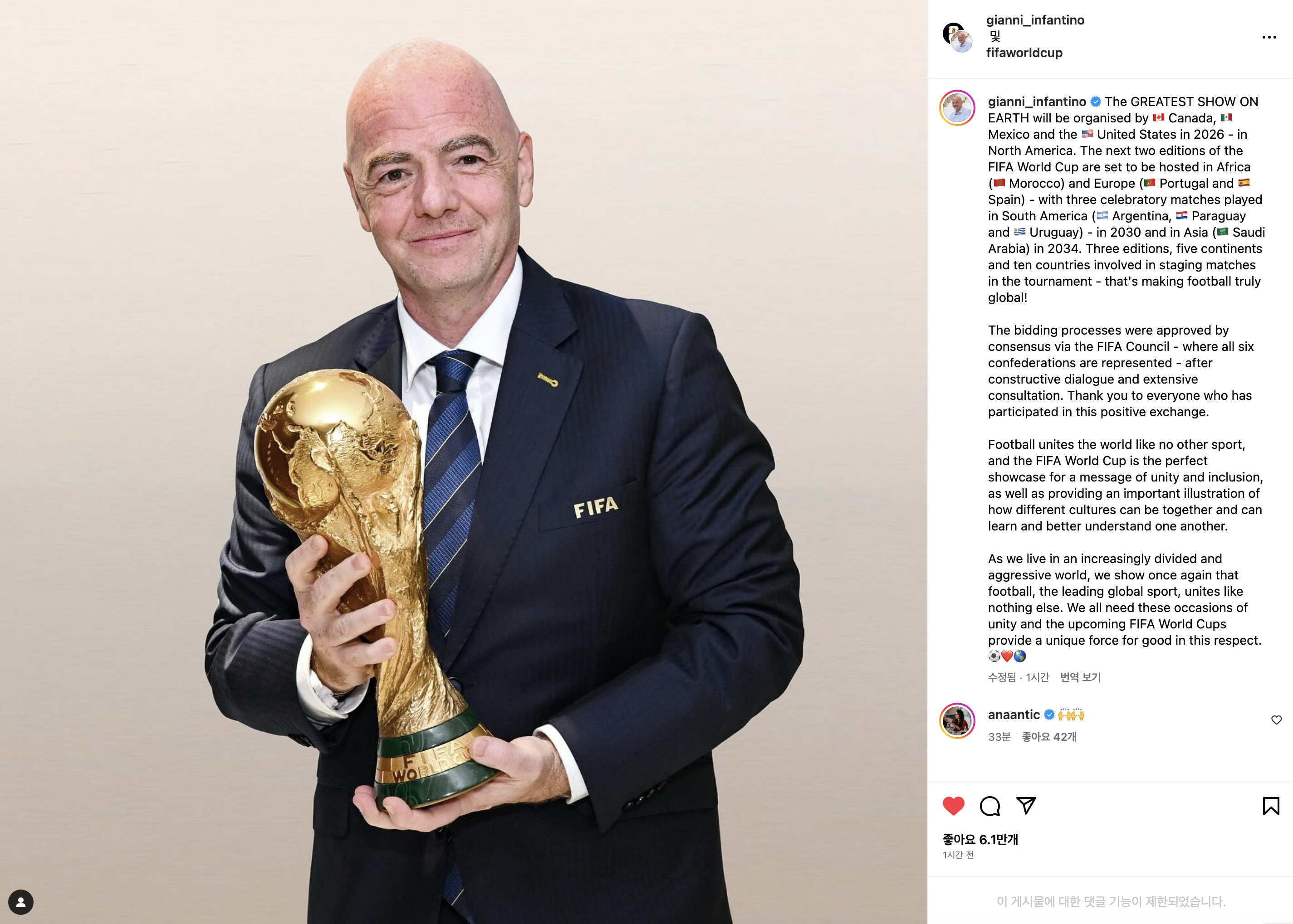 절차상 내년 4분기에나 발표될 것으로 보였던 2034 월드컵 개최지는 사우디만 유치 의향서를 제출한 유일한 나라가 되었다는 FIFA의 공식 발표가 있은 후 불과 몇 시간 뒤 잔니 인판티노 FIFA 회장이 6개 대륙 연맹을 대표하는 FIFA 평의회가 후보 요청을 승인한 후 사우디가 2034년 월드컵을 개최하게 될 것이라고 자신과 FIFA World Cup의 인스타 계정을 통해 공식 발표하면서 사실상 끝나버렸습니다.