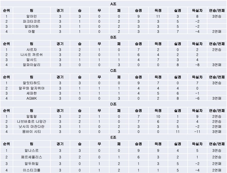 AFC 징계위원회의 최종 징계 확정으로 두 경기만 치르고도 조선두였던 알잇티하드는 2위권팀들과의 승점차를 5점으로 벌리며 16강 진출에 유리한 고지에 올랐고, 세파한은 득실차에 밀려 2위에서 3위로 주저앉았습니다.