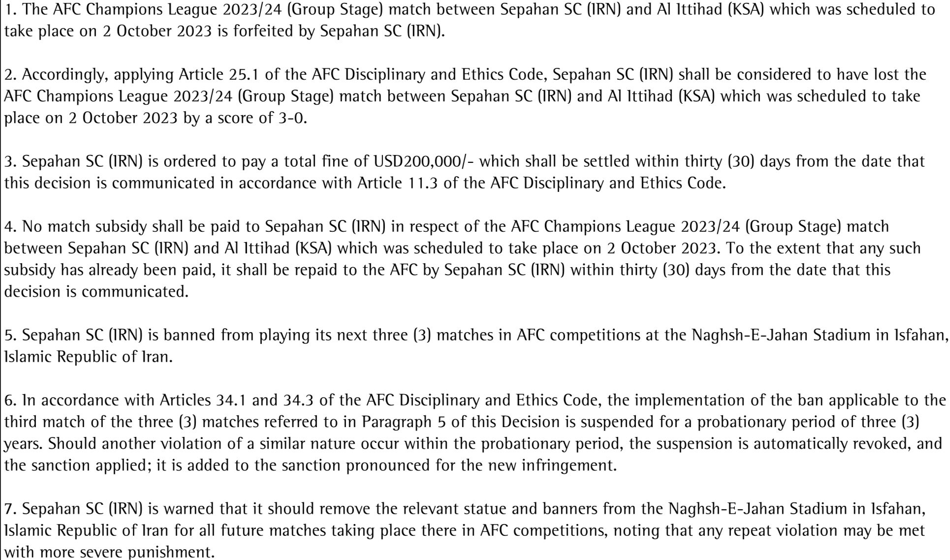 AFC 징계 위원회는 당초 10월 2일 열릴 예정이었지만, 알잇티하드의 경기 거부로 취소되었던 아챔 조별예선 2차전 세파한-알잇티하드전과 관련하여 홈팀 세파한에 대해 몰수패를 포함한 징계를 공식 발표했습니다.