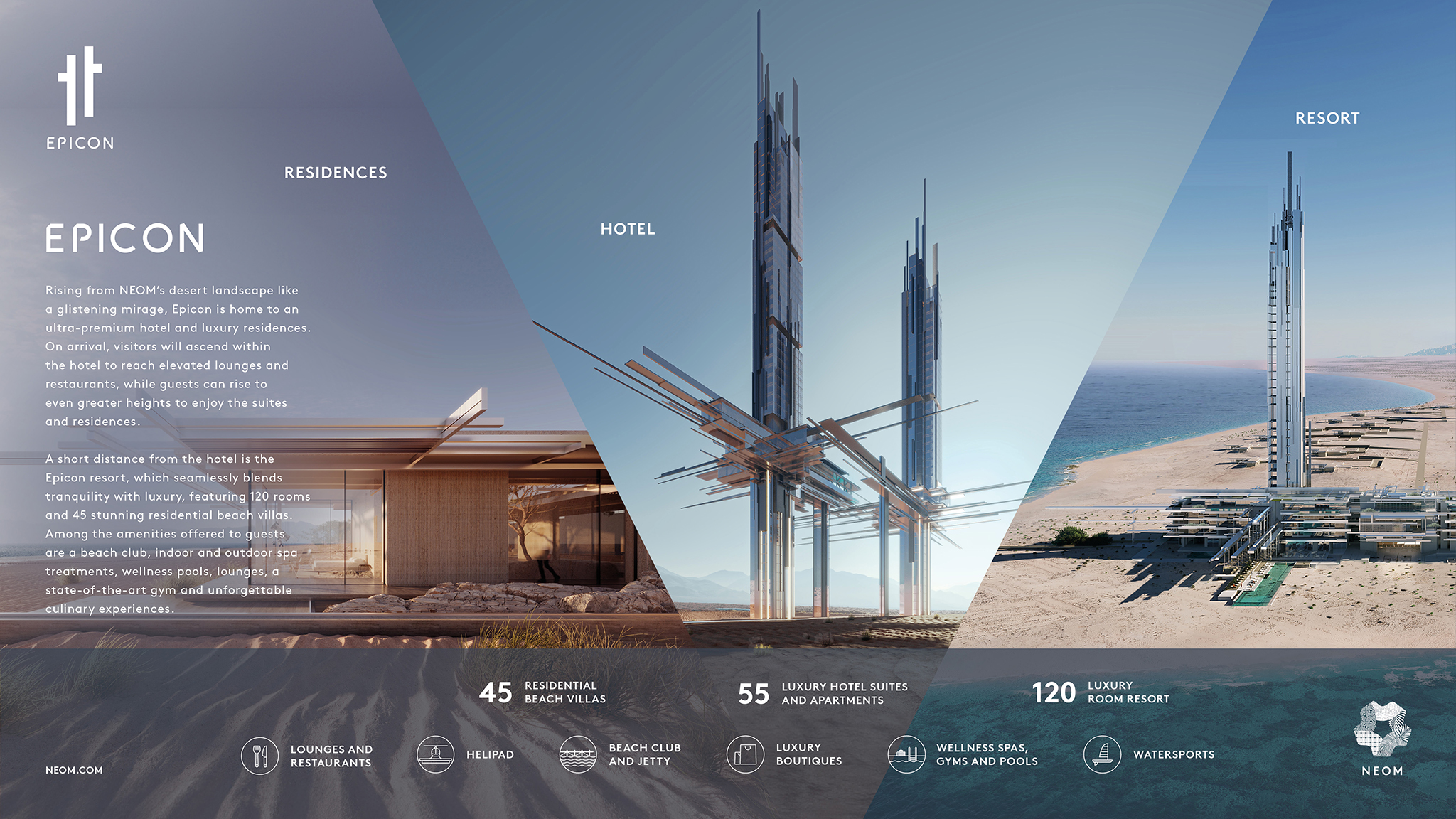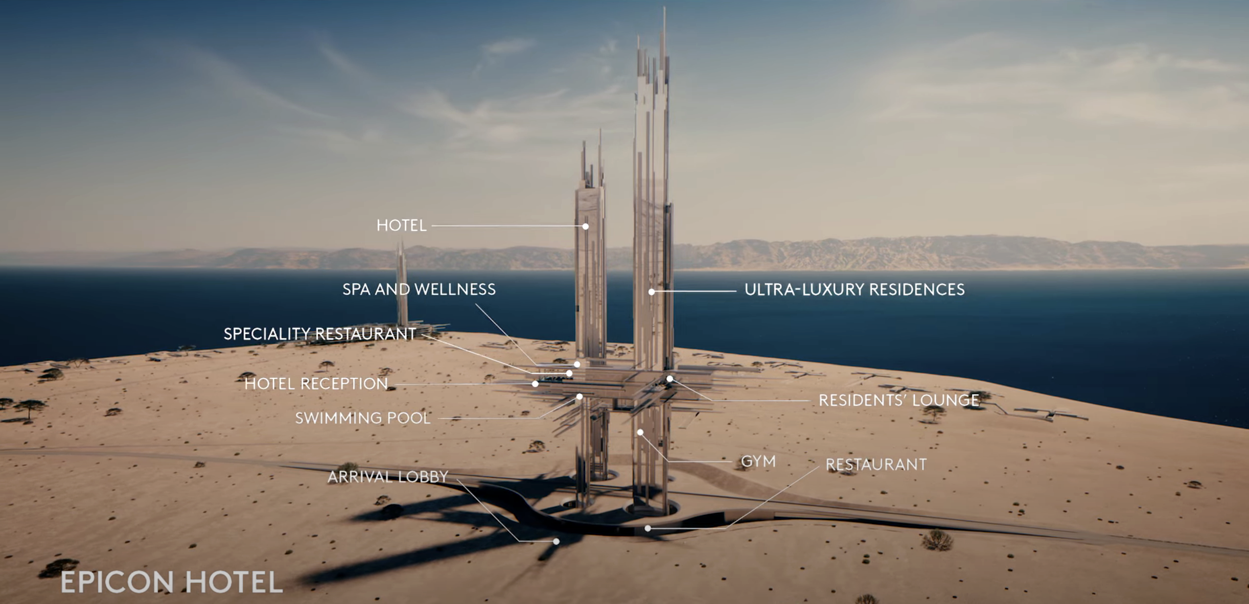 각각 225m 및 275m 높이의 타워에 들어설 에피콘 호텔은 41개의 럭셔리 객실과 14개의 스위트룸과 아파트로 이루어지며, 투숙객들이 이용할 수 있는 다양한 시설이 들어서게 됩니다.