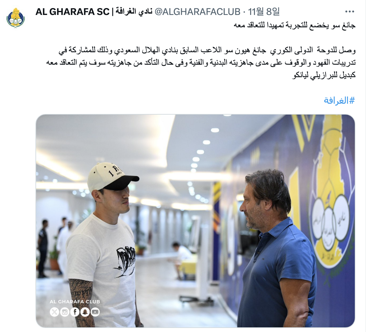 알힐랄에서의 퇴단이 발표된 후 완치 및 복귀를 위해 재활 중이라는 소식만 간간히 전해지던 그의 동향은 지난 8일 카타르 리그의 알가라파가 공식 계정을 통해 장현수의 도하 도착 소식을 전하면서 알려졌습니다. 항암 치료 후 복귀하는 만큼 선수로 돌아올 준비가 되어 있는지 검증한 후, 이를 통과하면 브라질 수비수 리안코의 대체 선수로 계약할 계획이라는 소식과 함께 말이죠.