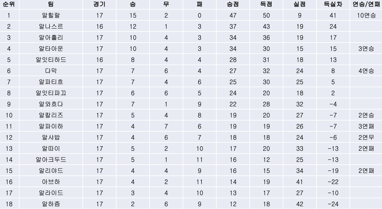 3) 2연패에 빠졌던 알파이하와 알아흘리의 경기에서는 피라스 알부라이칸의 결승골 등 전반에만 4골을 몰아넣은 알아흘리가 0대4로 승리하며 알파이하를 3연패에 빠뜨리며 여섯 경기 무패 행진을 이어갔습니다.