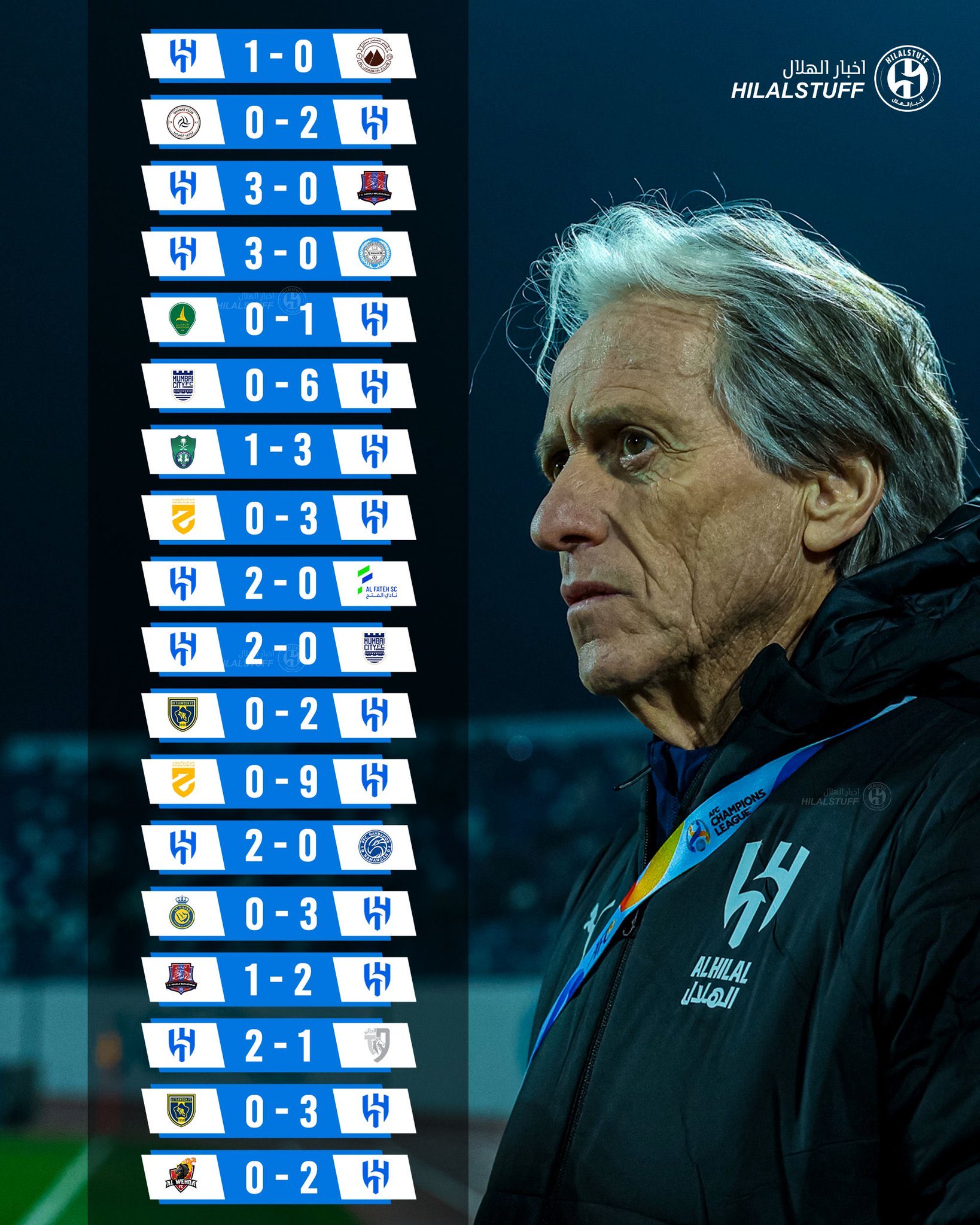 4) 당초 밤 9시 경기였으나, 알잇티하드의 클럽월드컵 일정 때문에 세 시간 앞당겨진 알힐랄과 알와흐다의 경기에서는 사우드 압둘하미드의 결승골과 여덟 경기 연속골을 기록 중인 알렉산다르 미트로비치의 쐐기골을 앞세운 알힐랄이 2대0으로 승리하며 리그 10연승을 달리며 선두를 질주했습니다. 여덟 경기 연속골을 기록 중인 알렉산다르 미트로비치는 득점 선두 크리스티아누 호날두와의 골차를 1골로 줄이는데 성공했습니다.알힐랄은 조르제 제수스 감독 부임 후 시즌 중 리그, 국왕컵, 아챔 등의 모든 대회를 포함한 공식 경기 18연승의 신기록을 세웠으며, 51득점 3실점의 경이적인 질주를 이어가고 있습니다. 무승부 경기를 포함하면 26경기 연속 무패 행진 질주 중! (유일하게 알나스르에게 패했던 킹 살만컵 결승전은 친선 대회여서 해당되지 않음)