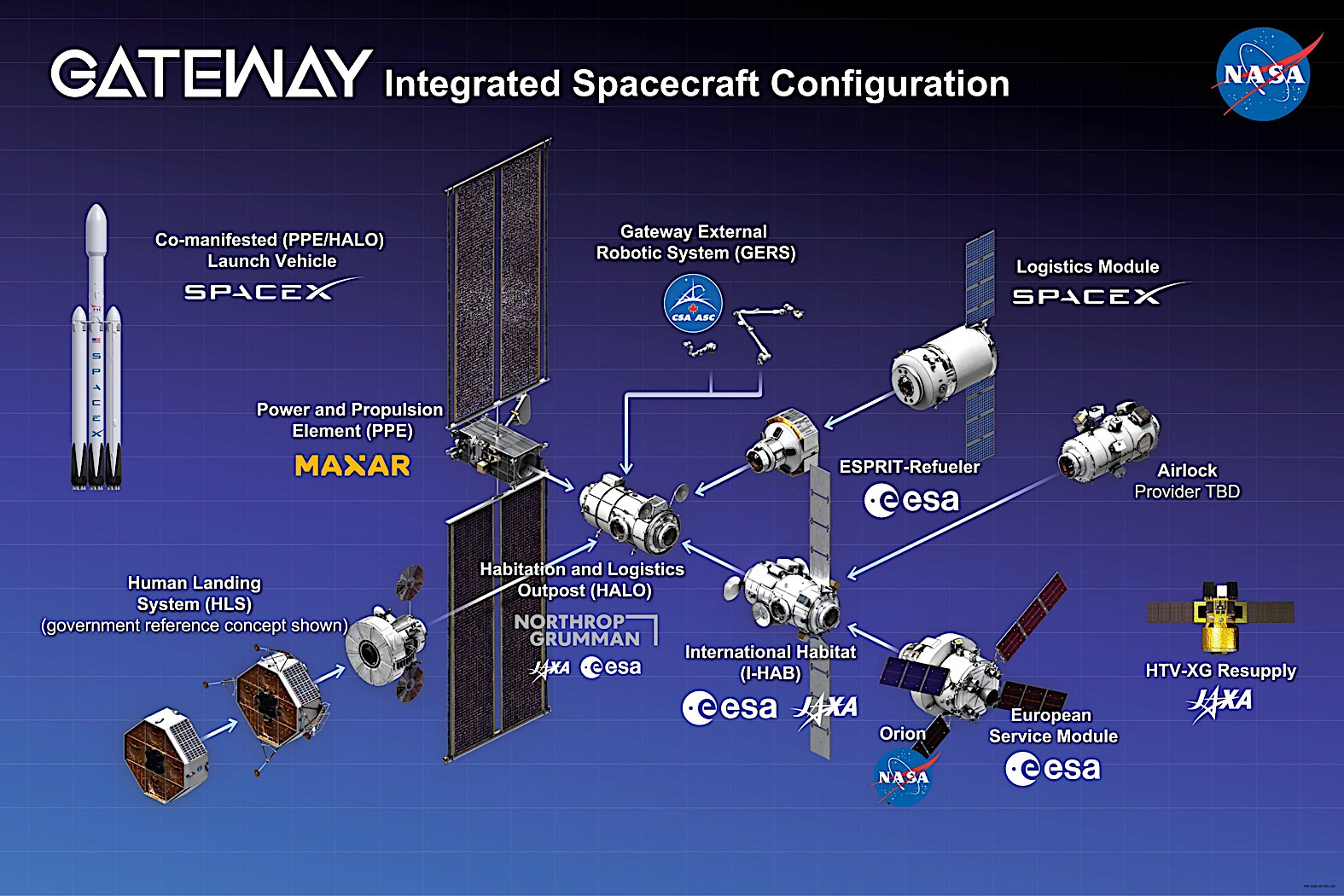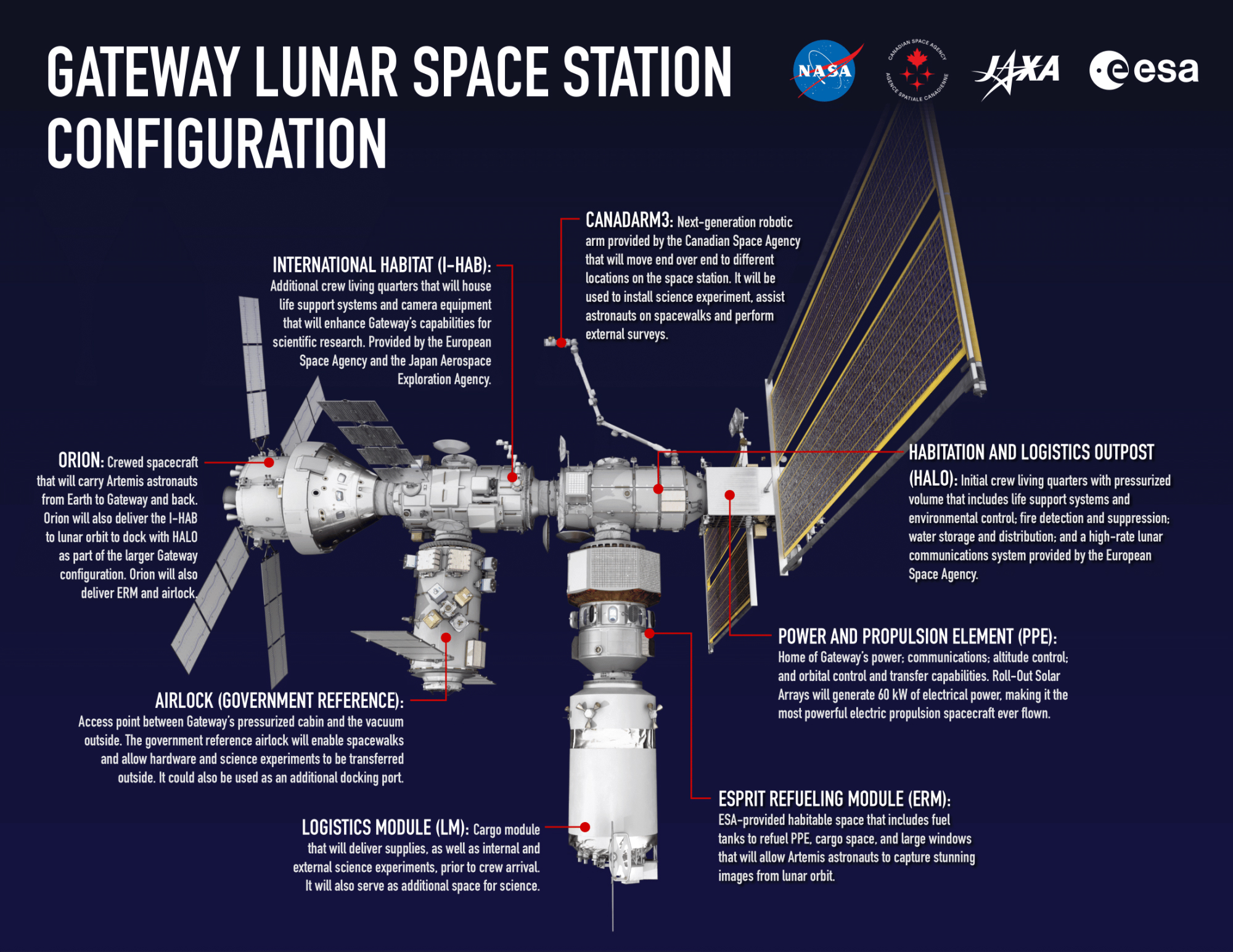 - PPE (동력 및 추진 요소), 화물 물류와 달, 지구 및 심우주 관찰을 위한 창에 연료를 공급할 ERM (Esprit 연료 공급 모듈)