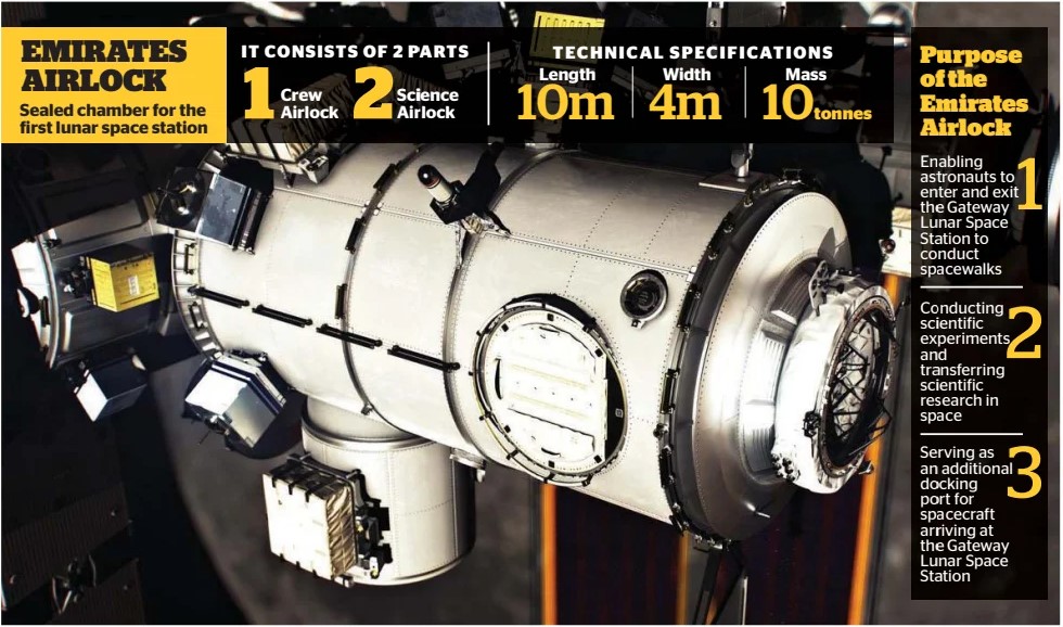 이에 덧붙여 무함마드 빈 라쉬드 우주 센터는 에어록 운영 외에 달 우주 정거장의 수명에 대한 엔지니링 지원도 맡게 됩니다. 게이트웨이에 설치될 에어록은 승무원과 연구자가 정거장 내 거주가능한 공간과 진공의 우주를 오갈 수 있는 통로이며, 서로 다른 공간 사이의 전송을 통해 계이트웨이 유지 관리 뿐만 아니라 심우주 환경에서 광범위한 과학을 지원할 것으로 기대되고 있습니다.