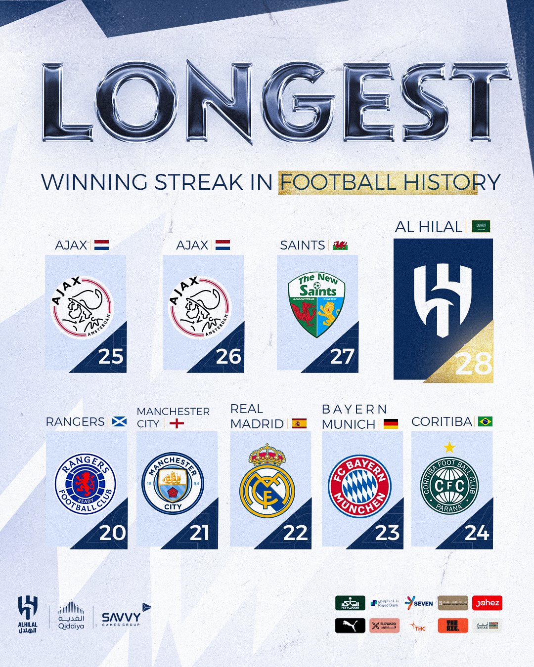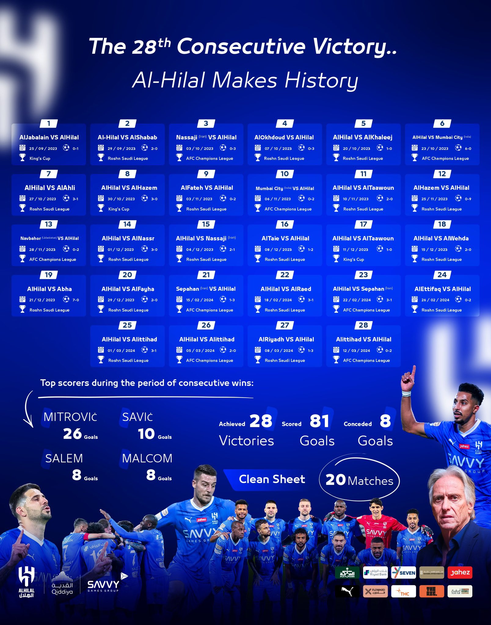 4) 리그 16연승, 국왕컵 3연승, 아챔 9연승으로 만든 알힐랄의 28연승은 81득점 8실점 (20경기 무실점)이라는 경이적인 페이스에서 비롯되었습니다.