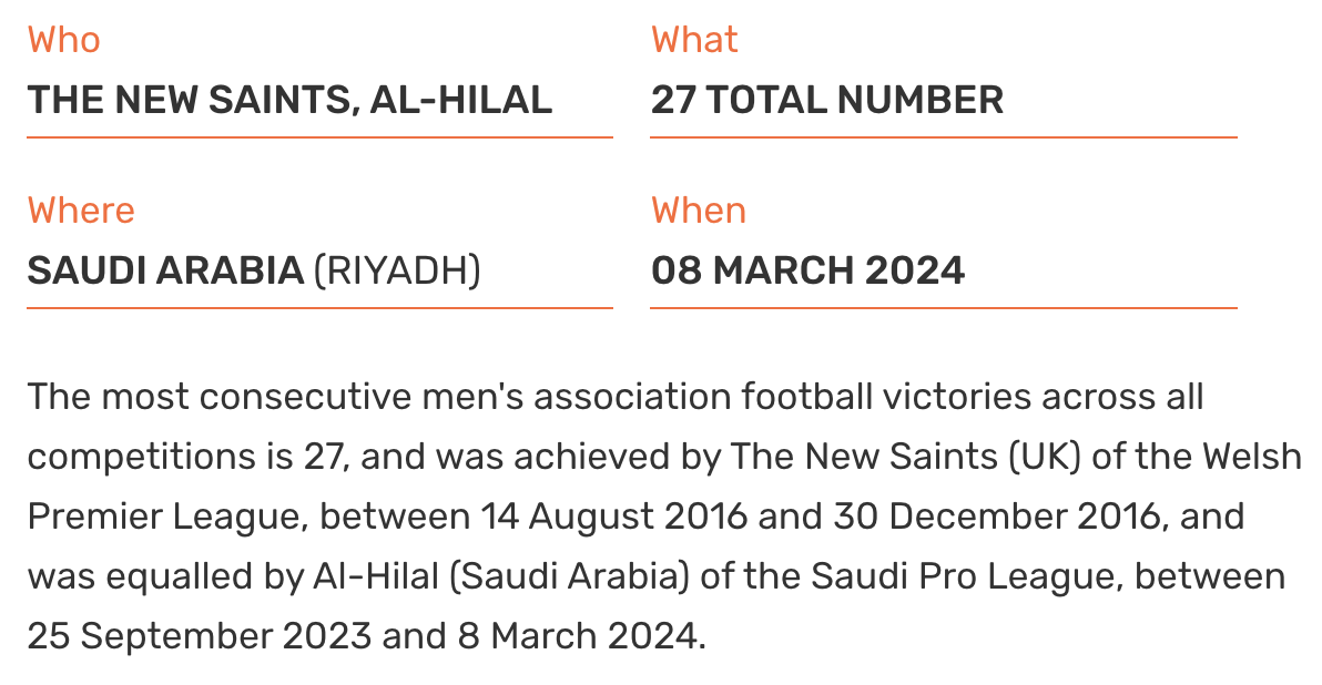 2) 알힐랄은 4일전 알리야드와의 리그전 역전승으로 27연승을 달성하며 웨일스 리그의 뉴 세인츠와 함께 기네스 기록에 이름을 올린 바 있으며, 알잇티하드를 꺾으면 뉴 세인츠를 밀어내고 단독 기록 보유팀이 됩니다.