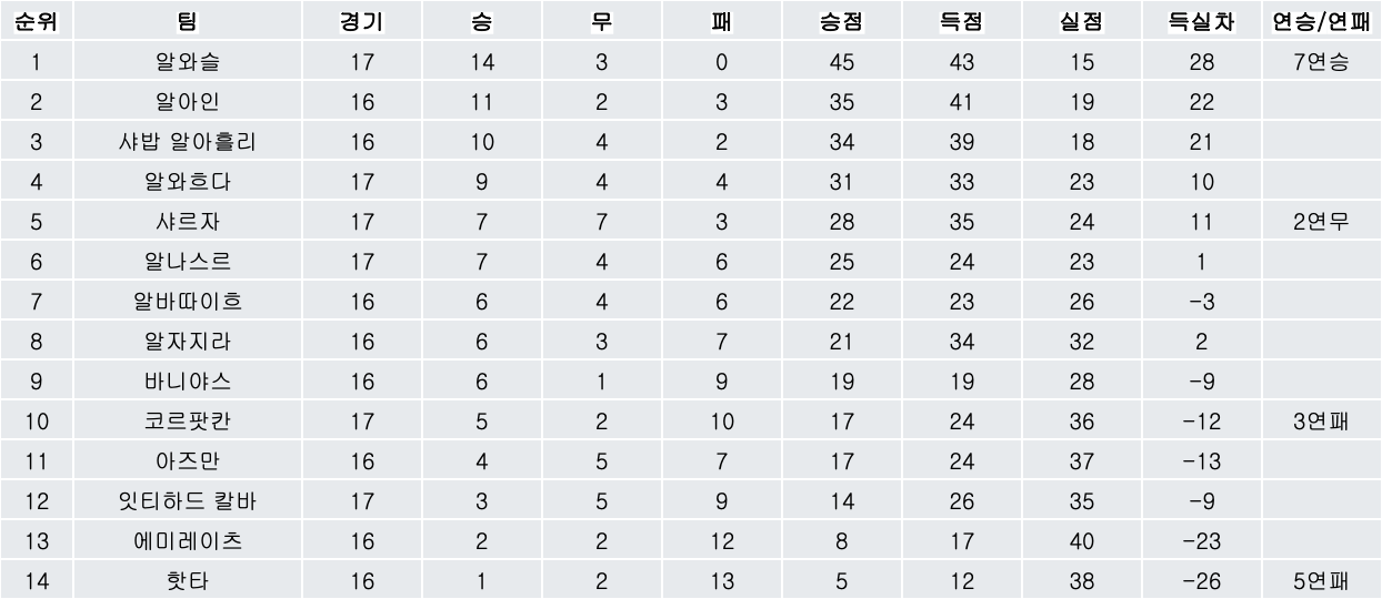 7) 알바따이흐와 알자지라의 경기에서는 다섯골을 주고받으며 역전에 재역전을 거듭한 끝에 후반 인저리 타임에 터진 알바로 올리베이라의 극장골을 앞세운 알바따이흐가 3대2 승리를 거두고 전반기 패배를 설욕했습니다. 알자지라는 네 경기에서 1무 3패를 기록하며 부진에서 벗어나지 못하고 있습니다.