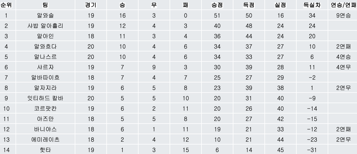 4) 2연승을 달리고 있던 알바따이흐와 3연승을 달리고 있던 알나스르의 경기에서는 아딜 타아랍트의 결승골을 앞세운 알나스르가 1대3으로 승리하고 전반기 패배를 설욕하며 4연승을 달렸습니다. 알나스르는 불안했던 리그 전반기를 지나 감독 교체 후 최근 일곱 경기 6승 1무로 쾌조의 기세를 이어가고 있습니다.