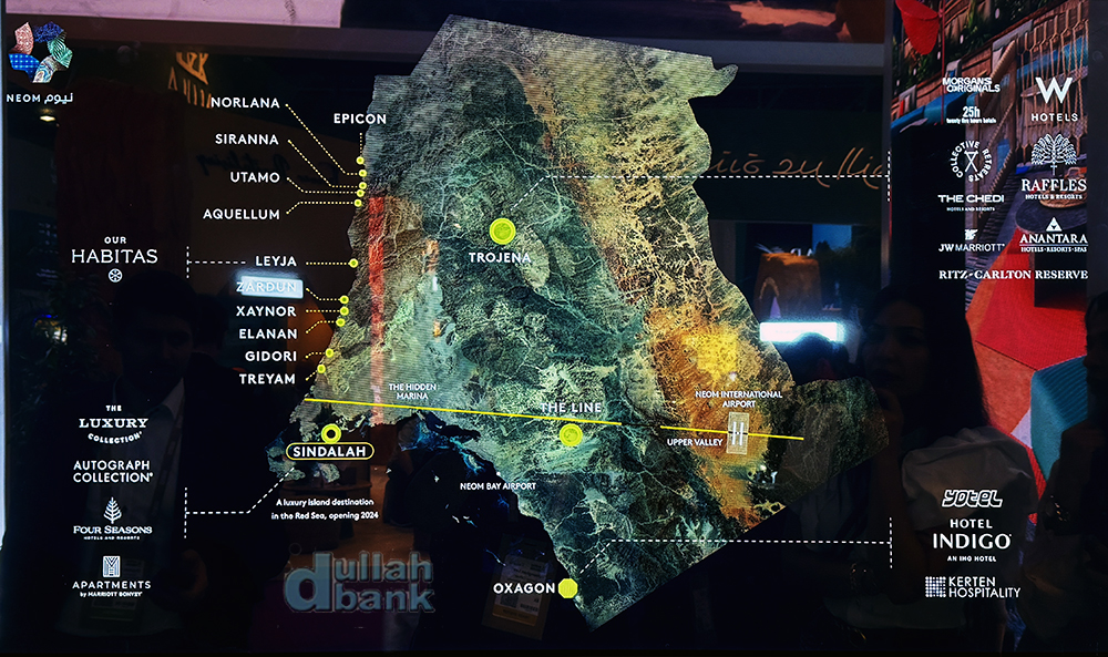 자우무르 발표 전까지 발표된 네옴의 주요 지역 위치 안내도. 가장 먼저 오픈할 신달라 아일랜드와 동계 아시안 게임이 열릴 트로제나에 들어설 다국적 호텔 체인 리조트들이 잇달아 발표된 바 있으며,