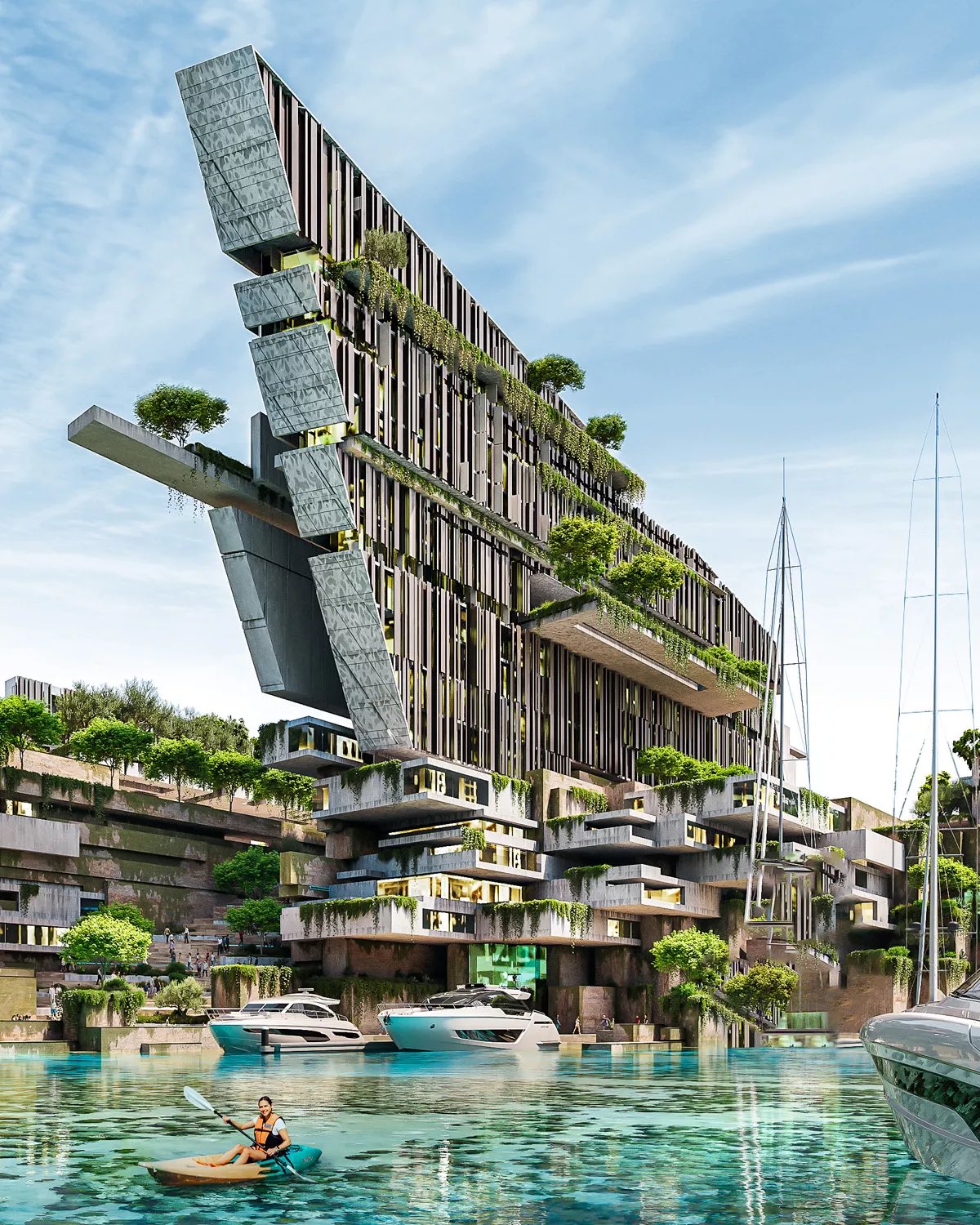 총연장 1.5km의 에어로포일이 가장 큰 요트 정박지 위로 솟아올라 요트 소유주를 위해 연중 내내 요트를 보호하고, 선착장 주민과 방문객에게 휴식처를 제공하게 됩니다. 에어로포일에는 중력을 무시하는 캔틸레버가 통합되어 세계에서 가장 큰 슈퍼요트를 맞이하는 선착장의 멋진 입구를 형성합니다.