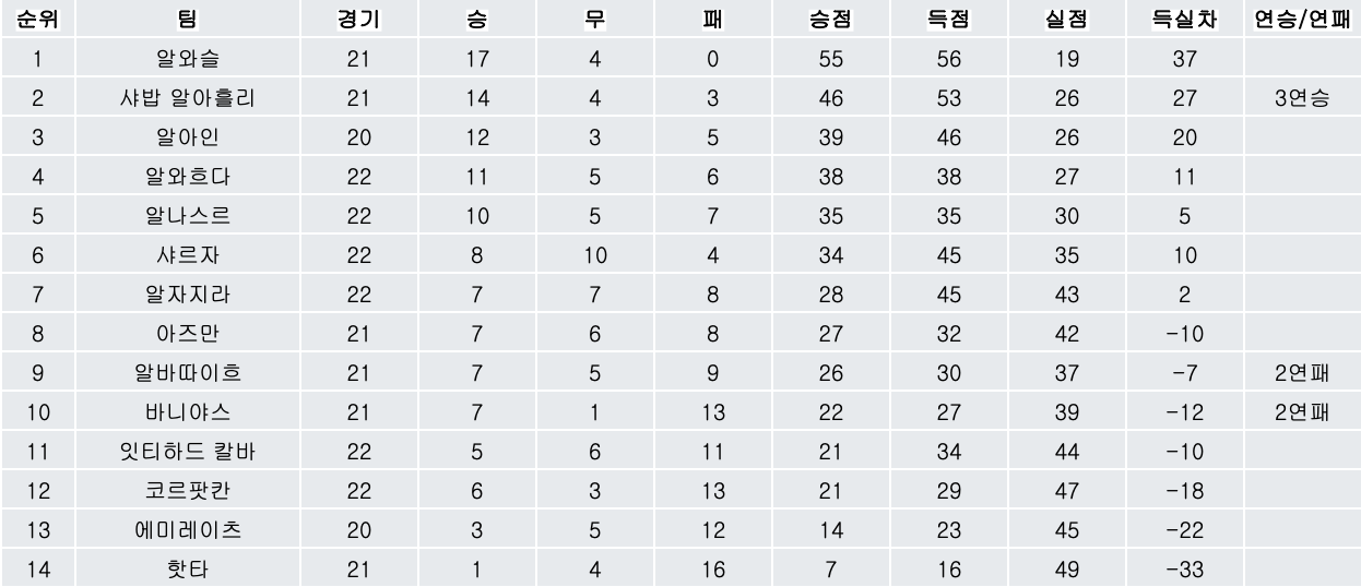 | [23/24 APL 23R] 알와흐다, 알와슬의 시즌 무패에 이어 리그 무패마저 깨며 우승 판도를 뒤흔들어! (0) | 2024.05.17 |