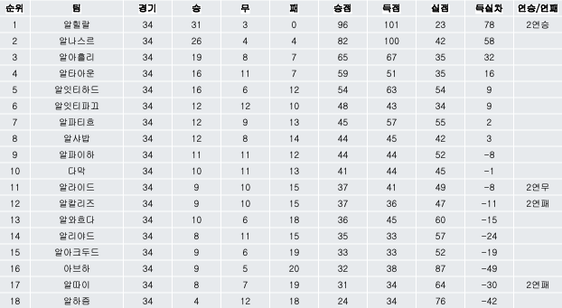 9) 강등이 확정된 알하즘과 알칼리즈전 승리로 리그 잔류의 희망을 이어갔던 아브하와의 경기에서는 무함마드 알싸니의 결승골을 앞세운 알하즘이 2대1로 승리하며 아브하의 발목을 잡아 함께 2부 리그로 강등되었습니다.