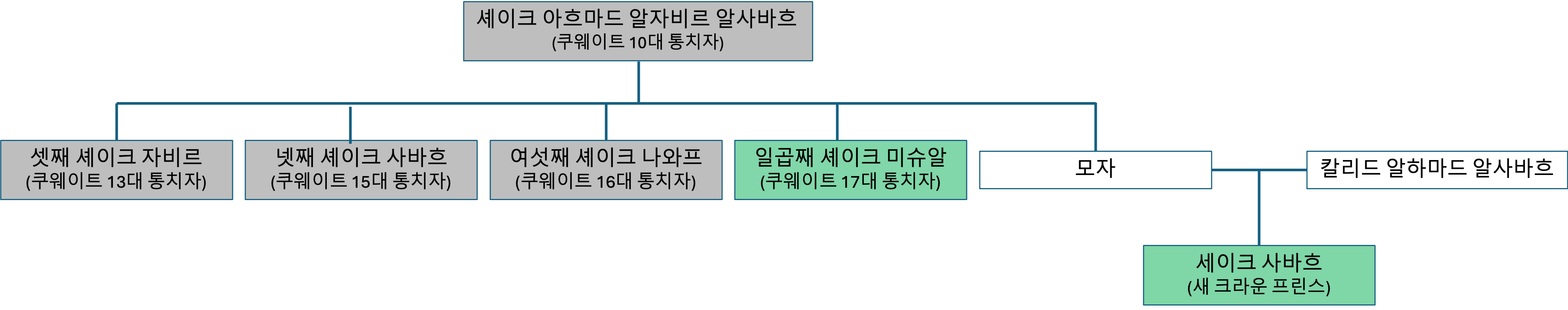 차기 통치 계승자는 알사바흐 씨족의 7대 통치자였던 무바라크 사바흐 알사바흐 (재임 1896년~1915년)의 직계 후손 중에서 씨족 의원회가 선정하며, 그의 자녀들 중에서도 그의 사후 쿠웨이트를 이어서 통치했던 셰이크 자비르 무바라크 알사바흐 (1915~1917년)와 차남 셰이크 살림 무바라크 알사바흐 (1917년~1921년)의 직계 후손들로 왕위를 이어왔습니다. 아미르가 되기 위한 양대 파벌의 권력 투쟁이 심화되자 알사바흐 가문은 자비르파에서 아미르가 나오면 다음 아미르는 살림파로, 그 다음 아미르는 자비르파에서 선출하는 양대 파벌간 교차계승이라는 독특한 승계구도에 합의하게 됩니다.