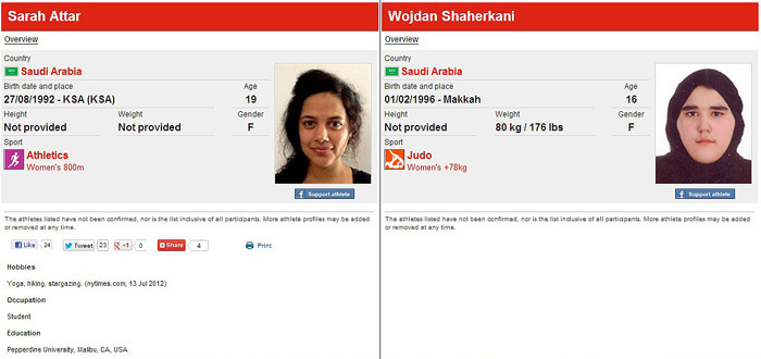 사우디는 IOC가 여성들의 인권을 문제삼아 올림픽에 여성 선수들을 출전시키지 않으면 퇴출시키겠다는 압박 속에 2012년 8월 런던 올림픽에 사우디 역사상 첫 여자 국가대표 선수 두 명을 출전시켰고,