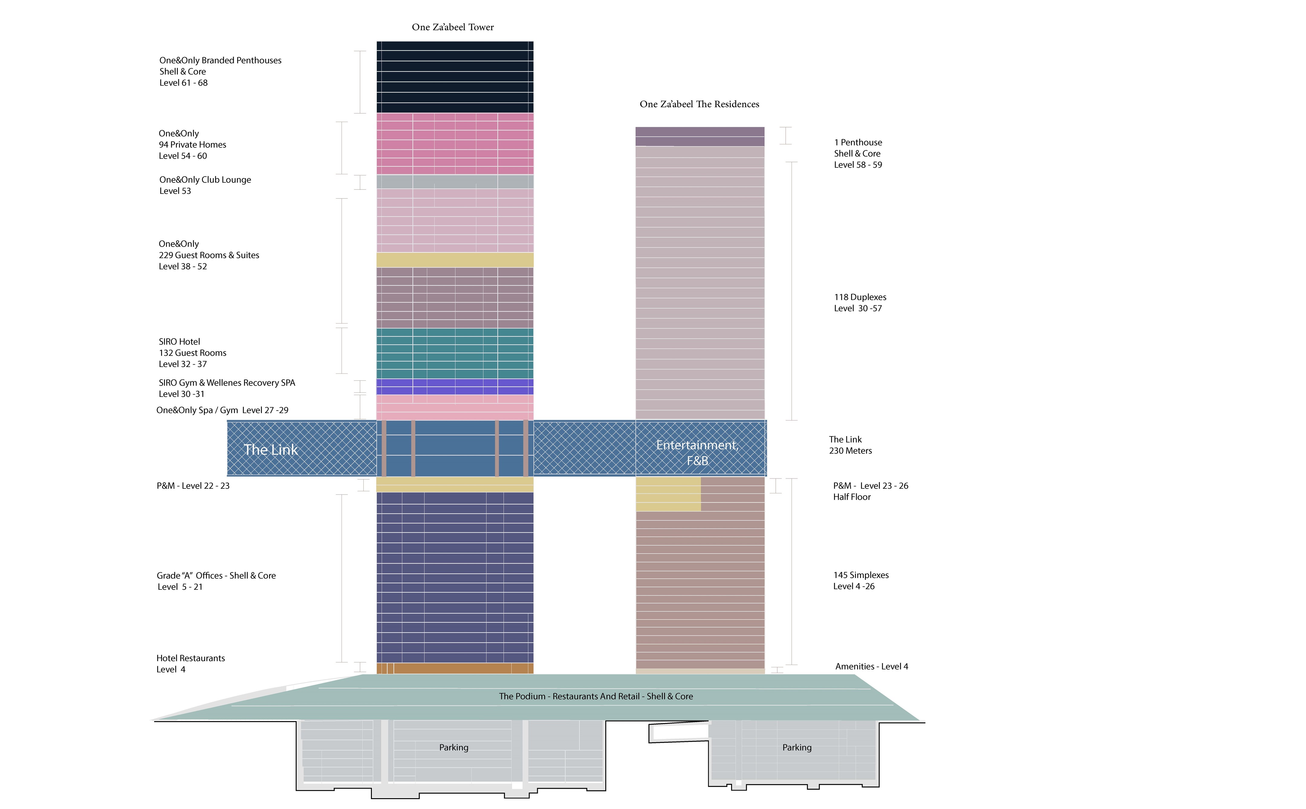 A동인 원 자빌 타워의 저층부에는 두바이 투자공사 본사를 비롯한 사무공간, 두 개의 호텔, 브랜드 레지던스가 들어서는 주상복합건물로, 레지던스 건물에는 단층 아파트와 복층 아파트가 들어선 주거 건물로 사용됩니다.