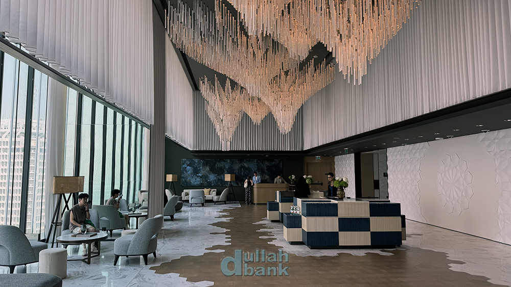 로비에서 바라보는 두바이 신도심. 바로 맞은편엔 두바이 월드트레이드 센터와 전시장. 그 너머에는 세로축으로 뻗어있는 셰이크 자이드 로드의 스카이 라인과 함께, 가로축으로 벌려지는 DIFC, 다운타운 두바이, 비즈니스 베이 일대의 스카이 라인을 감상할 수 있습니다.