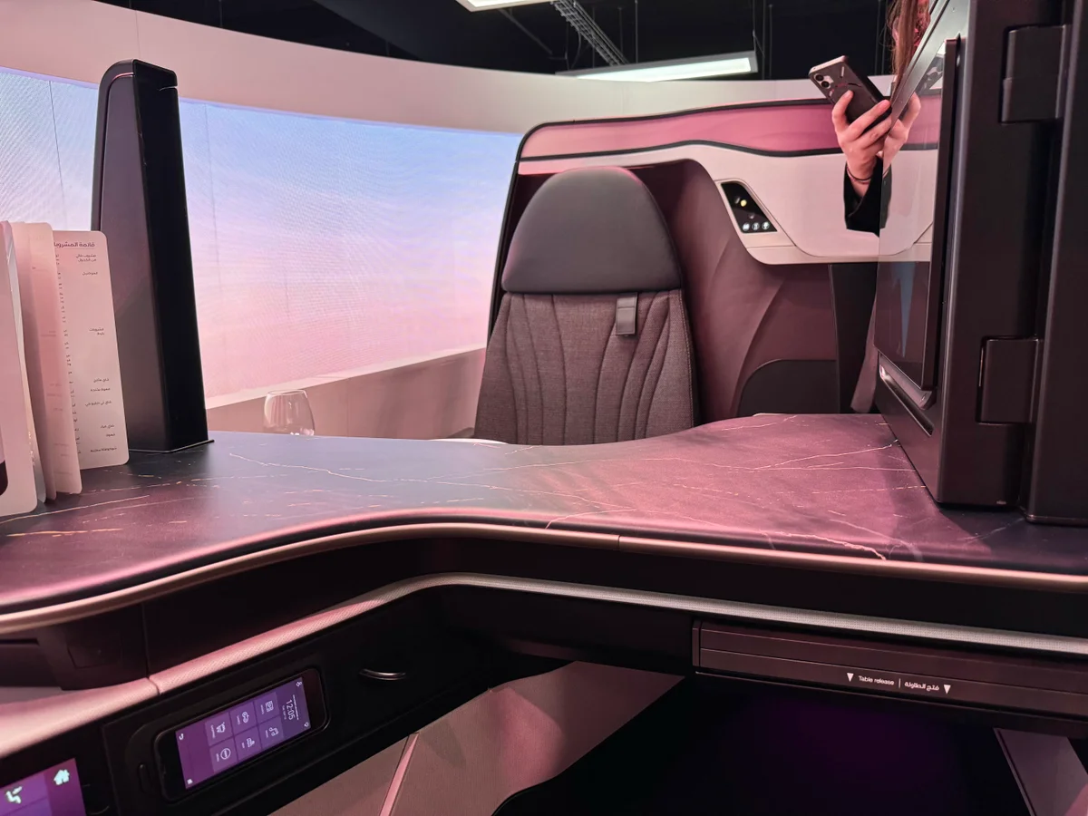 블루투스 연결도 지원하는 새 스크린은 현재의 Q스위트가 "하늘에서 가장 큰 소셜 및 생산성 공간"이라며 카타르 항공이 강점으로 내세웠던 4인용 쿼드 스위트 (Quad Suite) 뿐만 아니라,