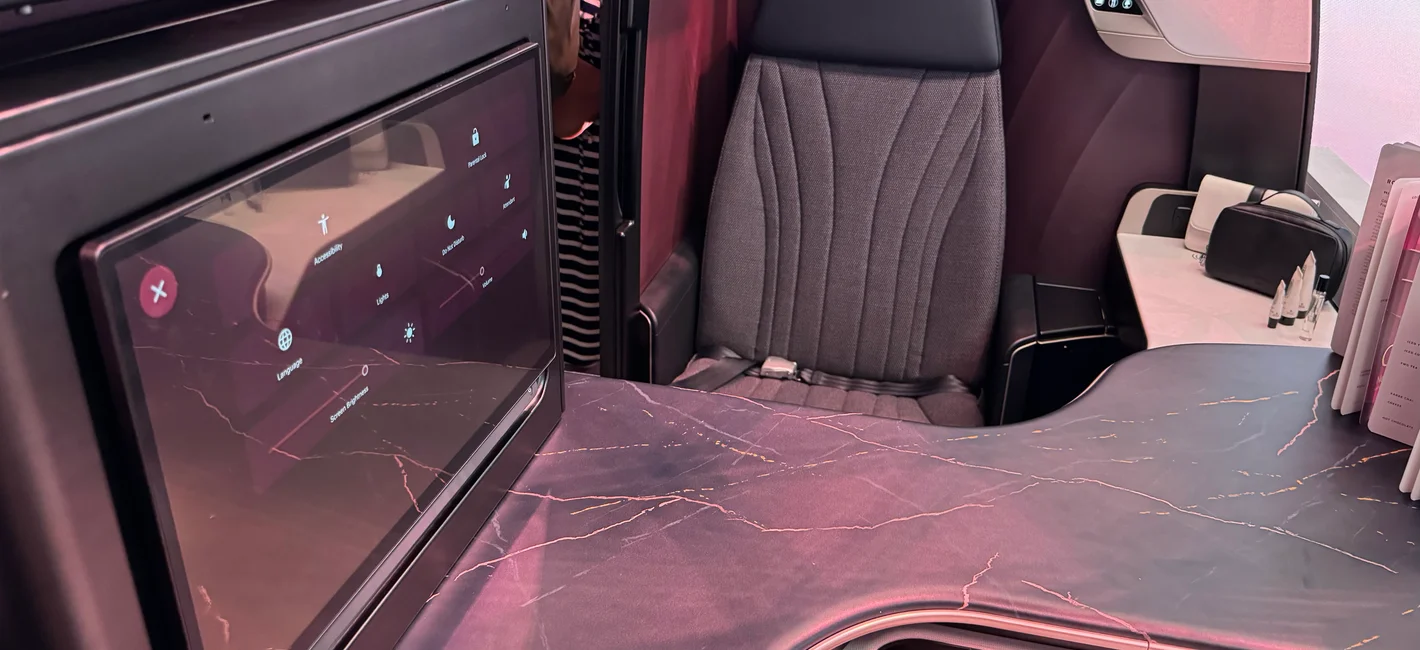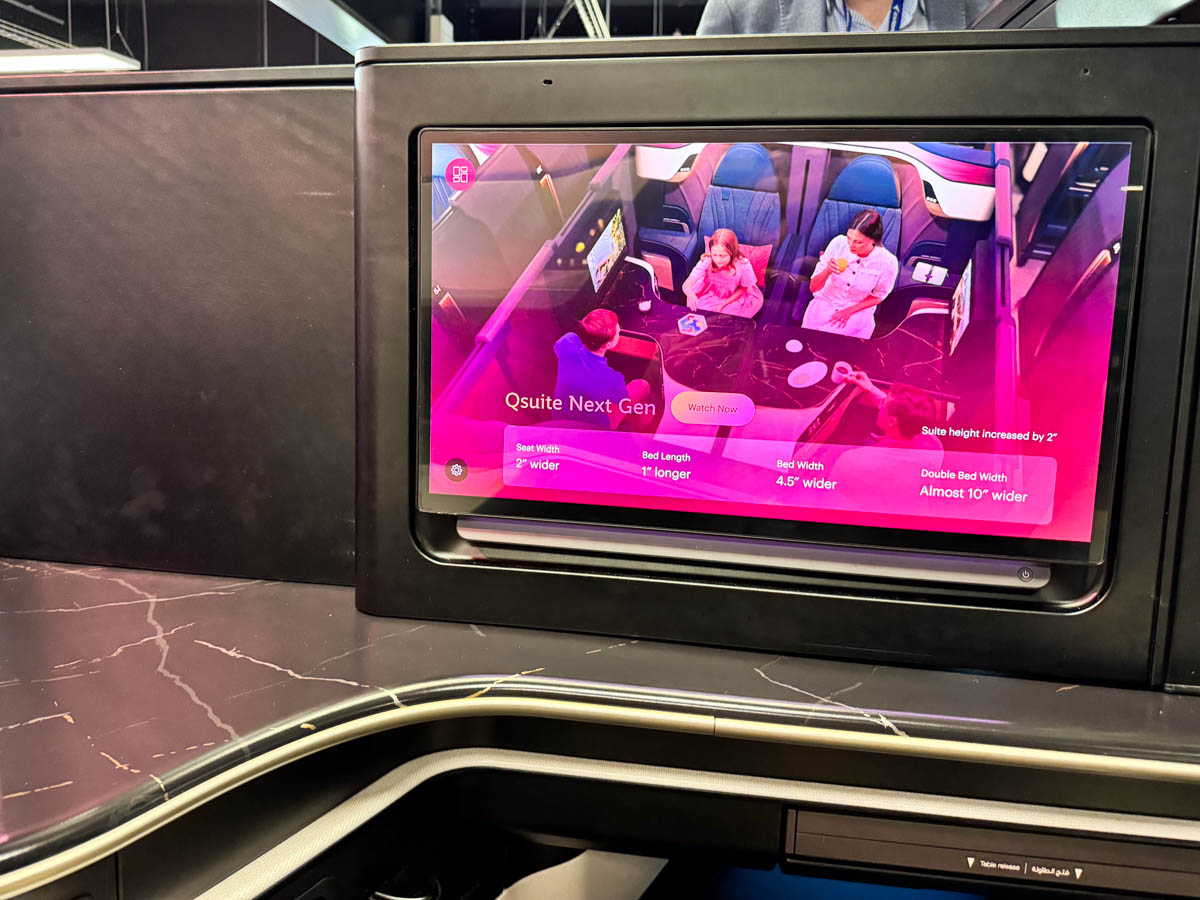블루투스 연결도 지원하는 새 스크린은 현재의 Q스위트가 "하늘에서 가장 큰 소셜 및 생산성 공간"이라며 카타르 항공이 강점으로 내세웠던 4인용 쿼드 스위트 (Quad Suite) 뿐만 아니라,