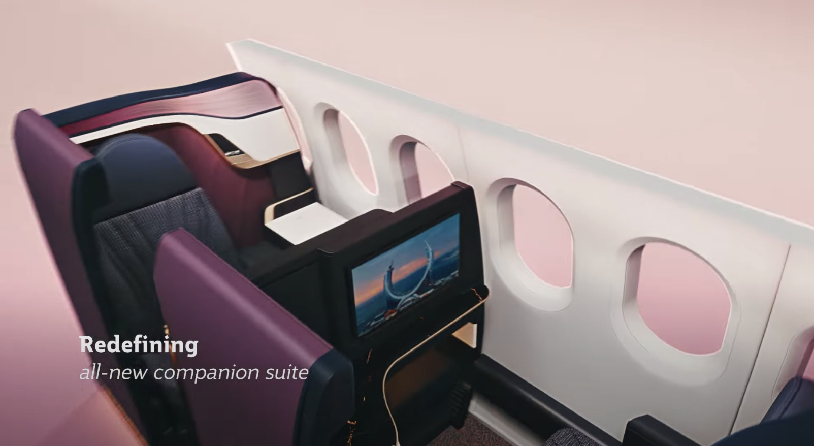 차세대 Q스위트에는 새롭게 양 창가에 위치한 앞뒤 좌석을 네 명의 승객을 위한 쿼드 스위트처럼 합쳐 두 명의 승객이 얼굴을 마주보면서 창가의 풍경과 함께 식사나 대화를 나눌 수 있는 2인용 컴패니언 스위트 (Companion Suite)를 도입했기 때문입니다.