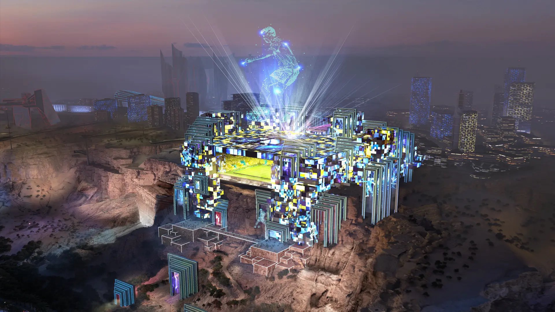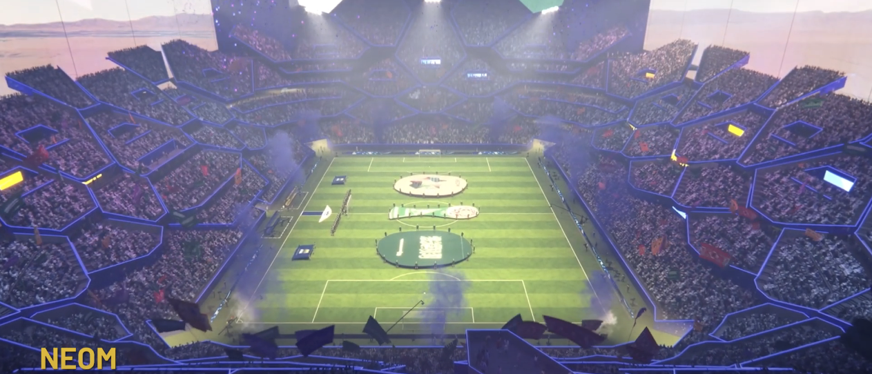 FIFA에 제출한 제안서를 공개하는 7월 31일 기자회견에서 공개했으며, 사우디가 야심차게 추진하고 있는 수직도시 네옴에 들어서게 되며 350미터 이상에 자리잡고 공중에 매달린 첫번째 경기장이 됩니다.