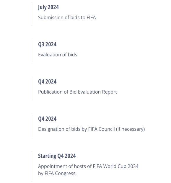 원래대로라면야 유치 제안서여야 겠지만, 2034 월드컵 유치전에는 사우디만 단독으로 참가했기에 사실상의 개최 제안서를 제출한 셈입니다. 엽기적인 2030 월드컵 공동 개최와 아시아-호주 지역으로 한정한 신청지역 제한 때문에 유치를 놓고 겨룰 경쟁국이 없어 사실상 개최를 확정한 상황이니까요.