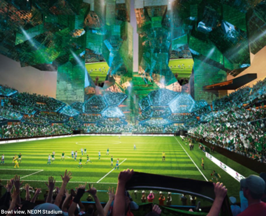FIFA에 제출한 제안서를 공개하는 7월 31일 기자회견에서 공개했으며, 사우디가 야심차게 추진하고 있는 수직도시 네옴에 들어서게 되며 350미터 이상에 자리잡고 공중에 매달린 첫번째 경기장이 됩니다.