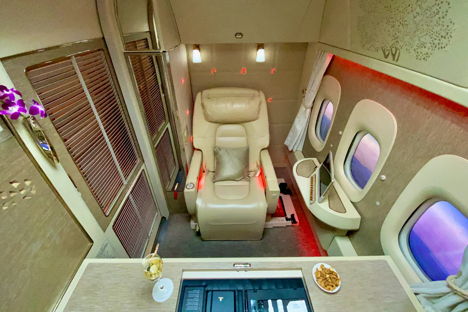 1-1-1 배열로 2열 총 6석의 퍼스트 클래스는 지난 2017년 에미레이트가 게임 체인저라며 보잉777에 도입했던 좌석이 최신 버전이기에 그대로 유지.
