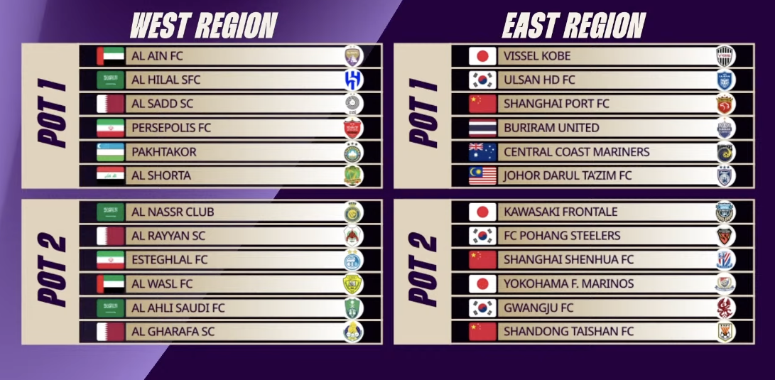 Pot 1은 각 지역에서 출전하는 여섯개 국가의 출전팀 중 최상위 팀 (리그 우승팀)이 하나씩 배정이 되고, 나머지 팀들은 Pot 2에 배정이 됩니다. 예외적으로 UAE의 경우 알와슬이 Pot 1에 배정이 되어야 하지만, 알아인이 지난 시즌 아챔 우승팀 자격으로 Pot 1에 자동 배정되었기에 알와슬은 지난 시즌 출전권이 걸린 모든 대회를 석권하고도 Pot 2에 배정이 되었습니다.