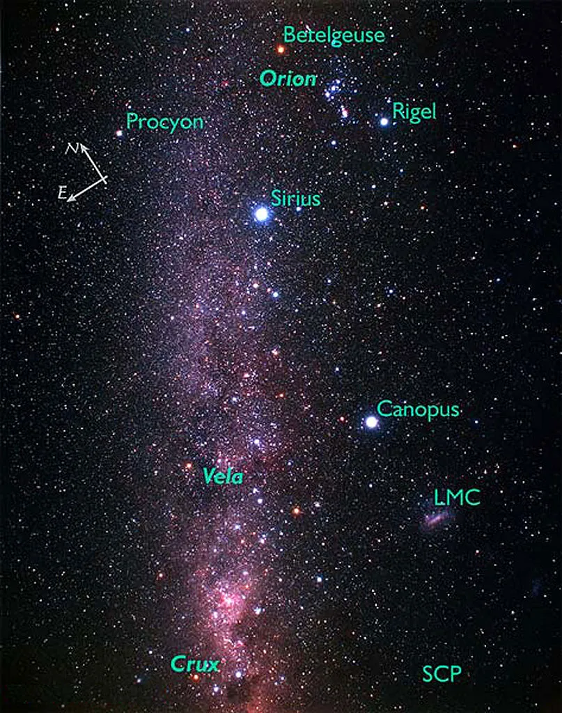 남반구 별자리까지 포함한 카노푸스의 위치. Crux는 남십자자리, Vela는 돛자리, LMC는 대마젤란 은하이다. SCP는 South Celestial Pole, 즉 천구의 남극이다.