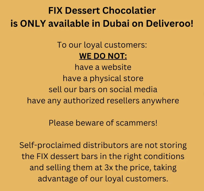 아이러니하게도 한국에서의 광풍과 더불어 대란템이 되어 버린 두바이 초콜릿의 원조 FIX Chocolate는 홈페이지도, 어딘가에 상설이든, 팝업이든 입점한 매장도 없이 딜리버루라는 UAE의 배민 같은 배달앱을 통해 오후 2시와 5시의 정해진 시간에만 주문해 두바이 내에서만 배송을 받을 수 밖에 없는 영세업체라는 점이 함정.