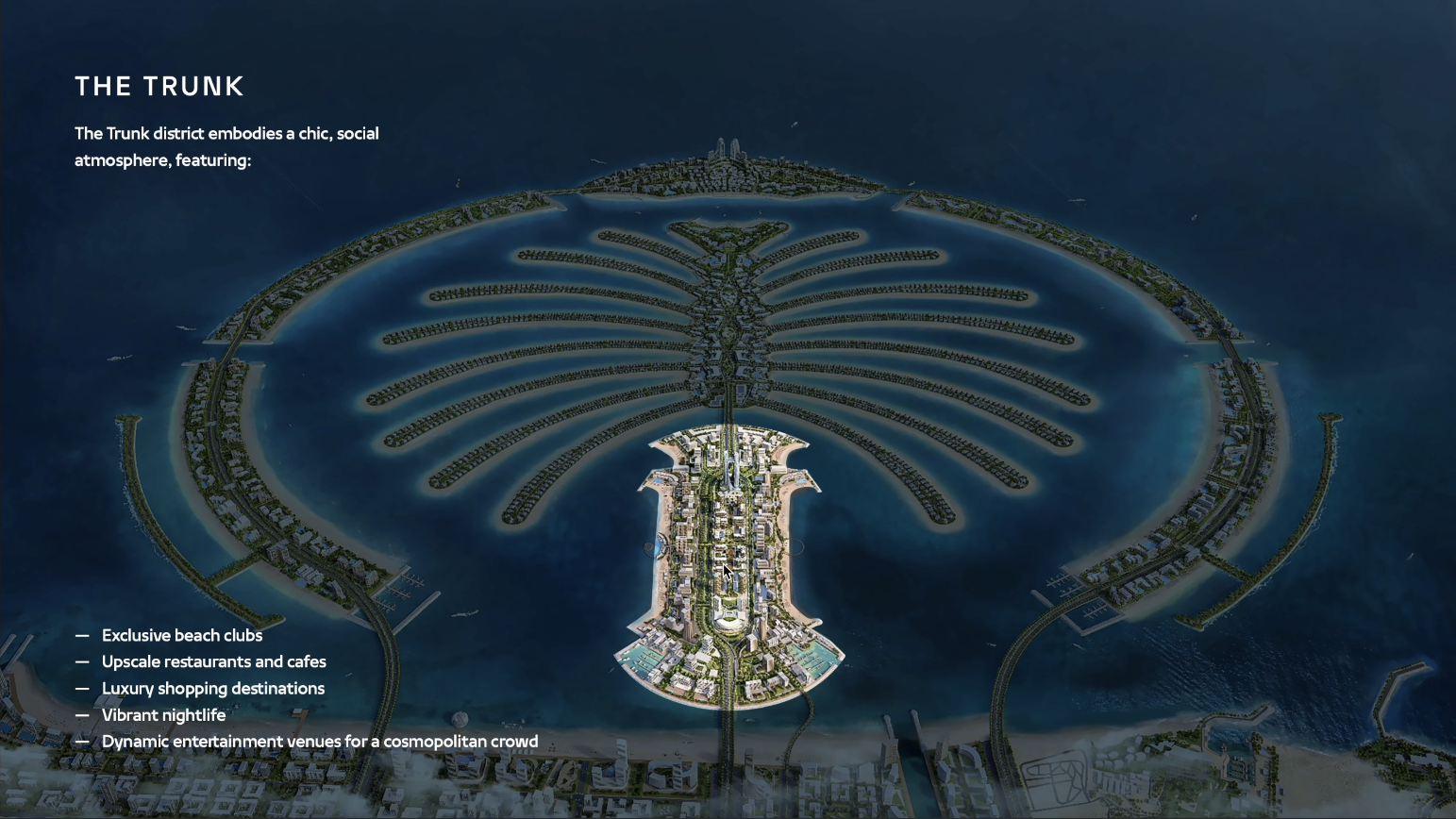 위에서 언급했듯, 팜 제벨 알리는 대추야자 잎의 외곽을 감싸는 Crown과 Crescents, 대추야자 잎을 형상화한 Spine, Fronds, Trunk 등으로 구별되어 구역마다 다른 방식으로 개발하게 됩니다.