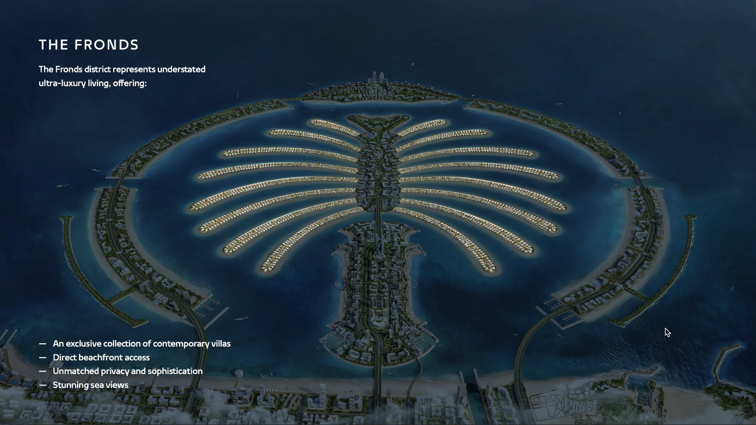 현재까지는 일부 고급빌라촌 판매만 간헐적으로 진행되고 있어서 실제로는 어떤 식으로 개발될지는 두고봐야 알겠지만 (팜 주메이라도 20년 가까이 개발 중이란 점을 감안하면...) 기본적으로는 팜 주메이라와 같은 구조를 갖고 있기에 비슷하게 진행될 것으로 보입니다.
