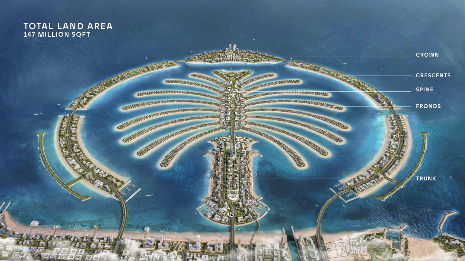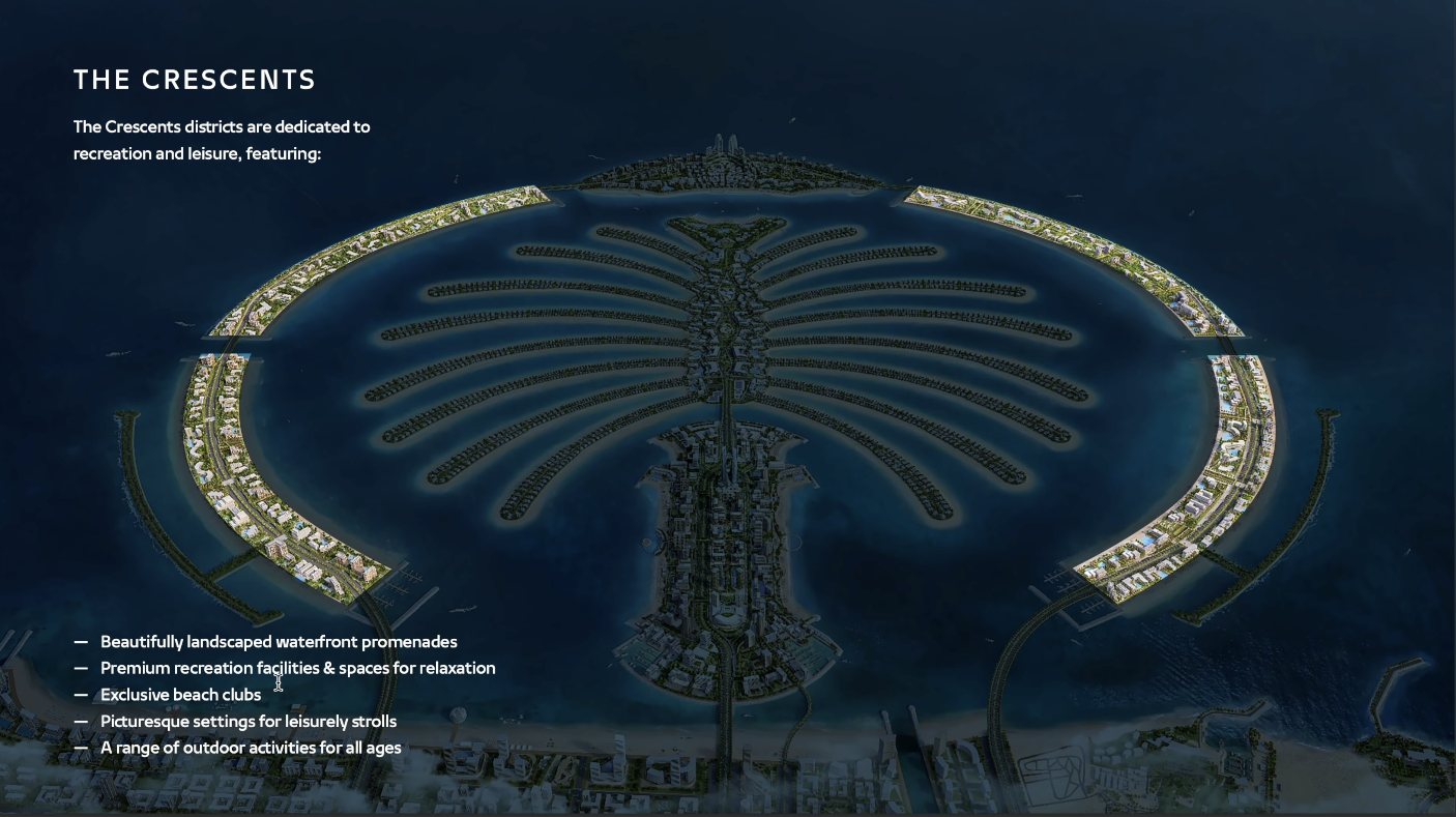 팜 주메이라와 마찬가지로 West Crescents와 East Crescents 불리게 될 이 구역은 팜 주메이라에서 볼 수 있듯 다양한 숙박, 거주시설과 각종 시설들이 들어설 예정입니다. 폭이 팜 주메이라의 270m에서 420m로 늘어나면서 보다 다양한 시설들이 들어설 기반을 갖고 있습니다.