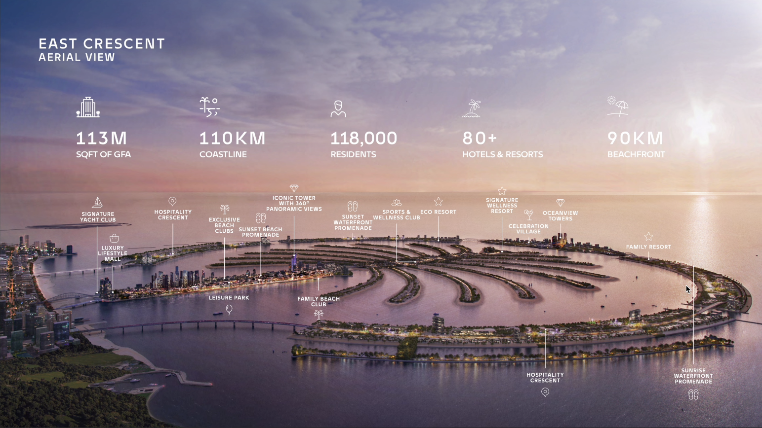 팜 주메이라와 마찬가지로 West Crescents와 East Crescents 불리게 될 이 구역은 팜 주메이라에서 볼 수 있듯 다양한 숙박, 거주시설과 각종 시설들이 들어설 예정입니다. 폭이 팜 주메이라의 270m에서 420m로 늘어나면서 보다 다양한 시설들이 들어설 기반을 갖고 있습니다.