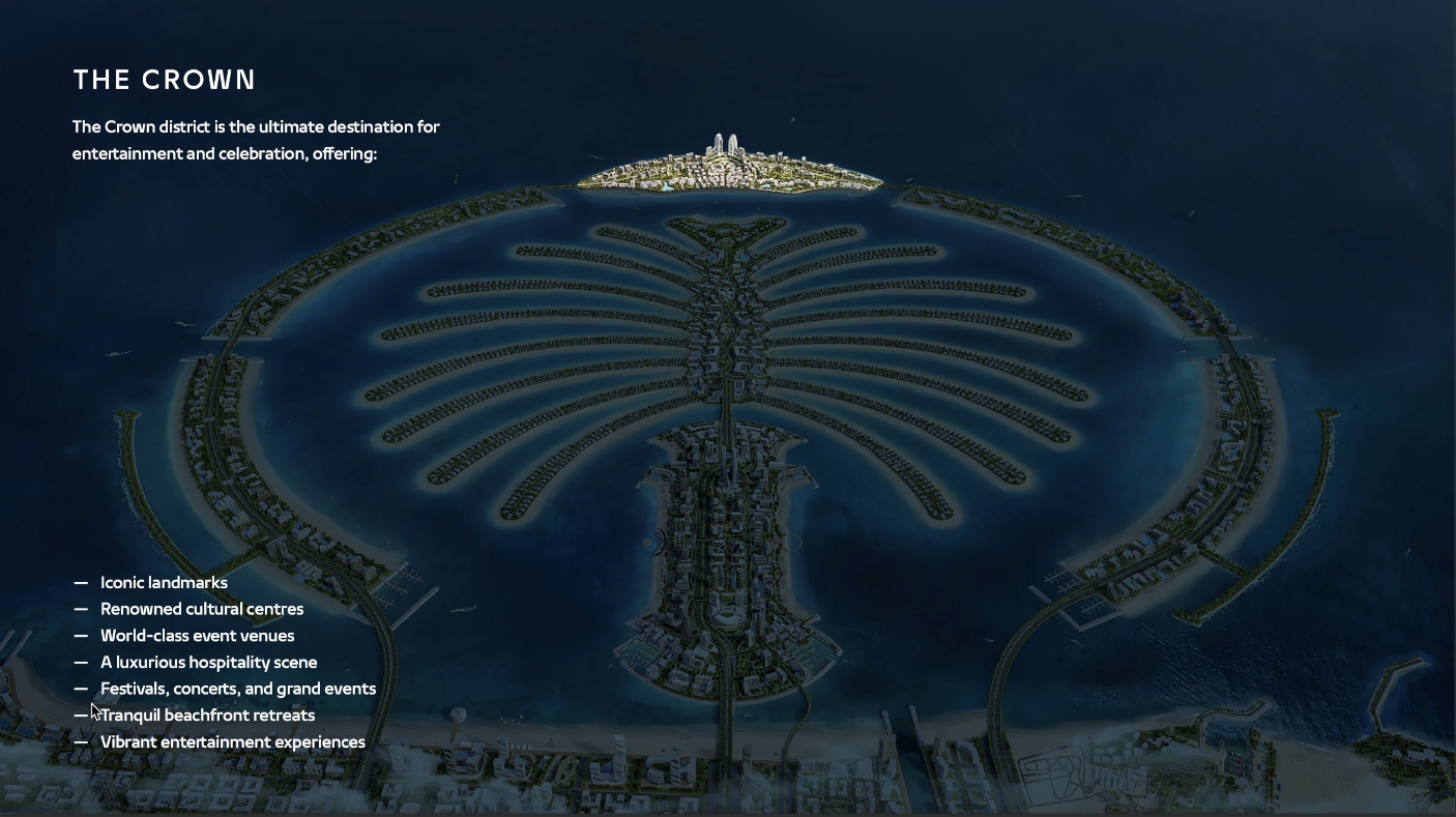 팜 주메이라에는 별도의 구역명이 없었던 Crown은 팜 주메이라의 아틀란티스 더 팜이나 로얄 아틀란티스 같은 랜드마크에다가 더욱 넓어진 공간을 활용한 다양한 문화공간이 들어서게 됩니다.