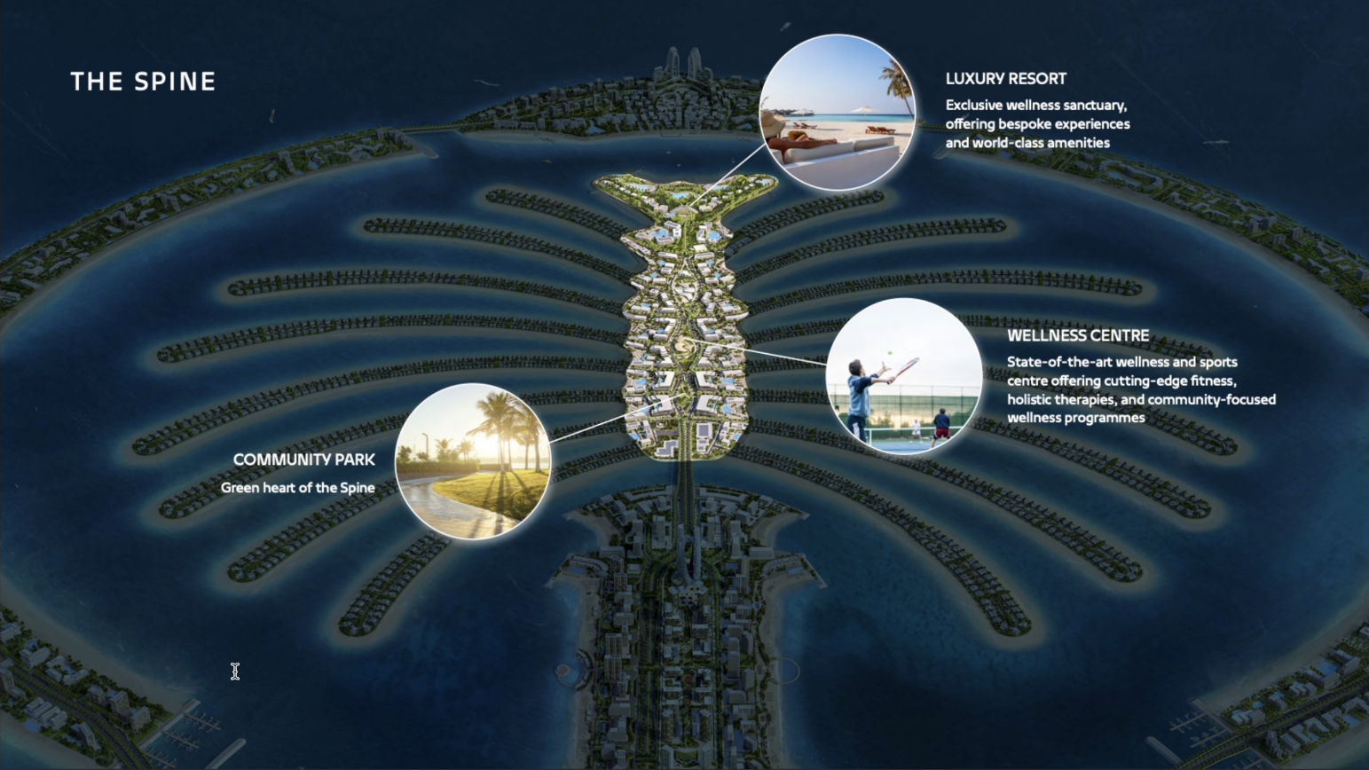 위에서 언급했듯, 팜 제벨 알리는 대추야자 잎의 외곽을 감싸는 Crown과 Crescents, 대추야자 잎을 형상화한 Spine, Fronds, Trunk 등으로 구별되어 구역마다 다른 방식으로 개발하게 됩니다.