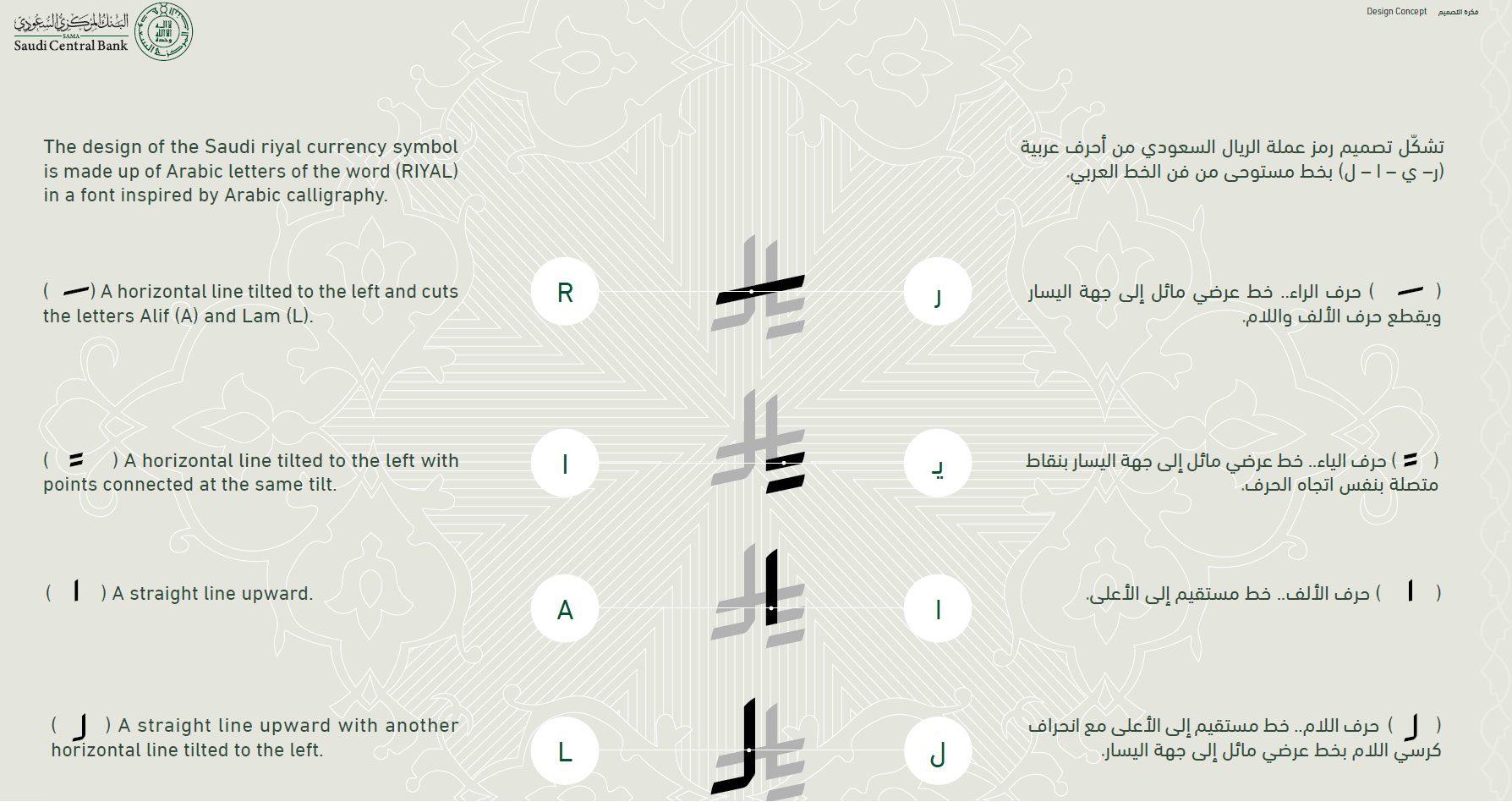 새 통화기호는 아랍어에 대한 자부심과 문화적 정체성을 반영하여 별도의 기호를 고안한 것이 아닌 아랍어 문자 (ريال)을 현대적으로 재해석하여 기호로 만들었기 때문입니다.