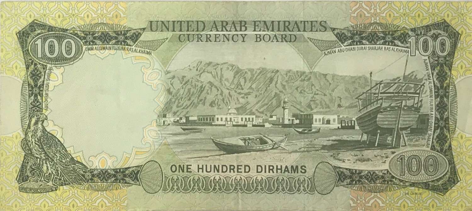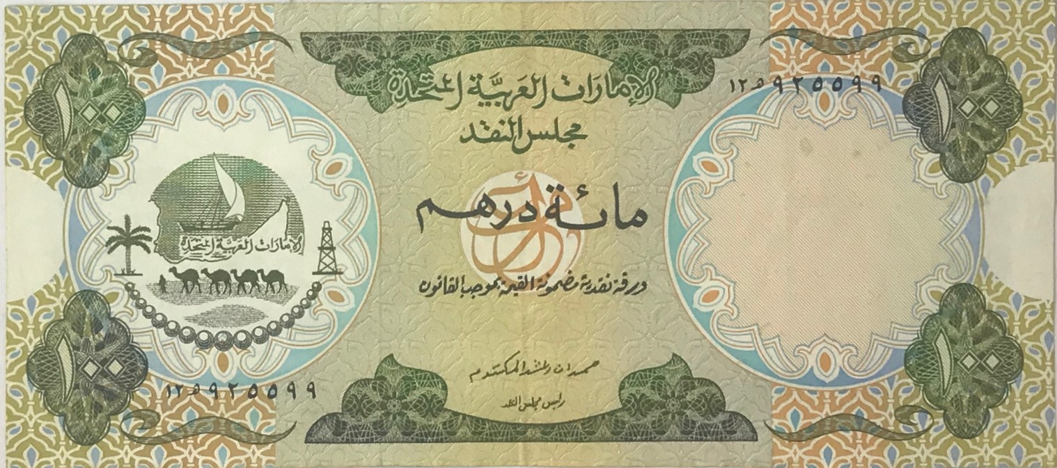 1973년 처음 선보인 100디르함 지폐는 당시 나온 다른 지폐들과 마찬가지로 특별한 랜드마크가 담기지 않았습니다.