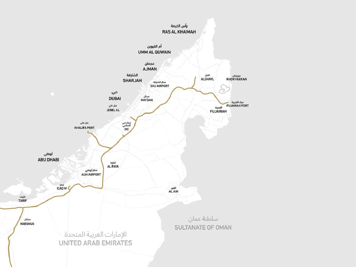 푸자이라에 있는 푸자이라항과 에티하드 레일이 담겨있습니다. 1983년 개항한 푸자이라항은 UAE 동부에서 가장 큰 항구이자, 싱가포르에 이어 세계에서 두번째로 큰 벙커링 (고체, 액체, 기체연료 또는 기타 에너지원을 해상 선박용 추진 및 특정 용도 에너지로 부두 또는 전용 선방에서 공급하는 것)항구입니다.
