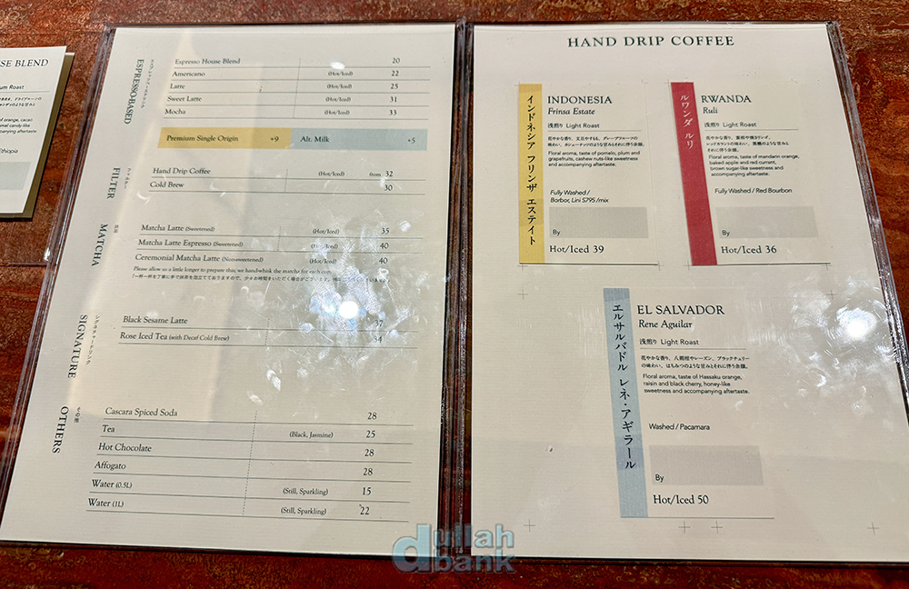 메뉴를 살펴봅니다. 메뉴판은 %아라비카에 비해 엄청 큰 반면, 선택할 수 있는 옵션은 인테리어만큼이나 단순합니다. 컵 사이즈 조정은 불가한 단일 사이즈이고, 차게 마실 것인지 따뜻하게 마실 것인지만을 선택할 수 있으며, 말차 라떼 한정으로 달게 마실지, 안 달게 마실 지를 선택할 수 있습니다. 그렇다보니 가격대는 %아라비카에 비해 꽤나 쎈 편이고, %아라비카와 달리 메뉴에 일본어가 병기되어 있는 것도 인상적이었습니다. 인테리어 컨셉도 좀 더 일본적인 느낌이 있죠.