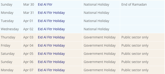 성향이 이질적인 UAE의 경우엔 이드 연휴가 상대적으로 짧은 대신 서력 신년, 이슬람력 신년에 무함마드 탄신일까지 두 국가가 챙기지 않는 날까지 공휴일로 챙기고 있습니다.